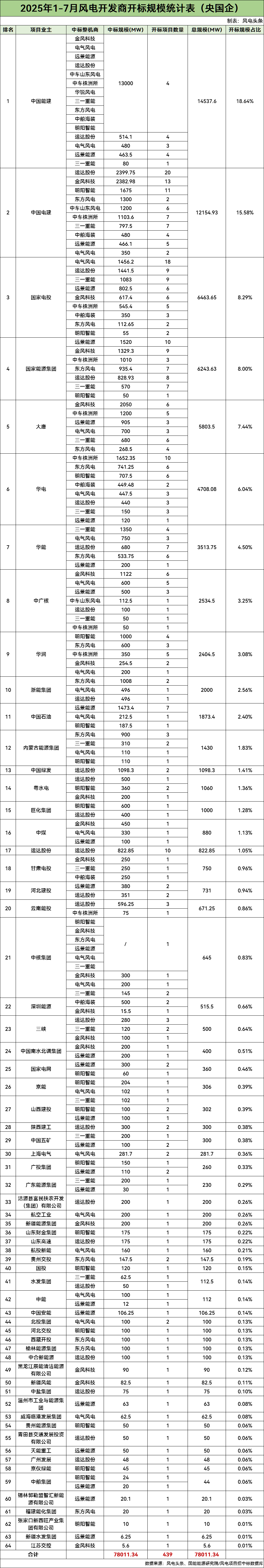 根据新能源圈风电项目数据库统计显示,2025年1-7月共有64家央国企开发商发布风电机组开标结果,央企开标总规模为63867.79MW,国企开标总规模为14143.55MW。