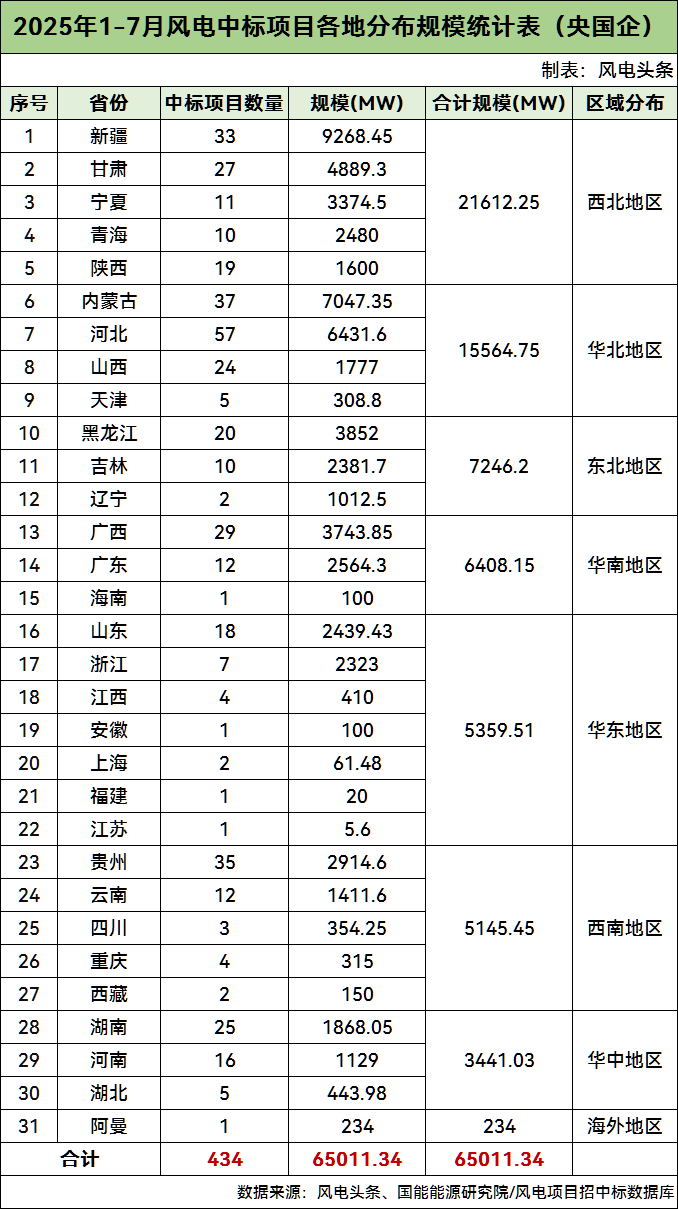 1、2025年1-7月央国企陆上和海上风电项目机组开标总规模约78.01GW,主要市场包括新疆、内蒙古、河北、甘肃、黑龙江、广西、宁夏、贵州等31地。