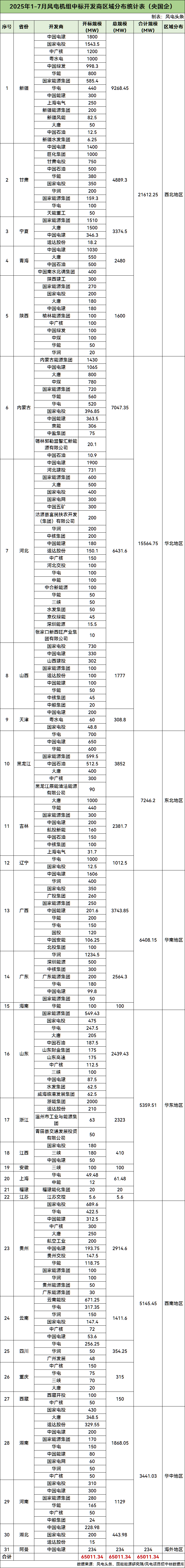 从省份分布区域情况来看,2025年1-7月,西北地区、华北地区为风电开发最火热的地方,总规模均超15GW,涉及省份有新疆、甘肃、宁夏、青海、陕西、内蒙古、河北、山西、天津。