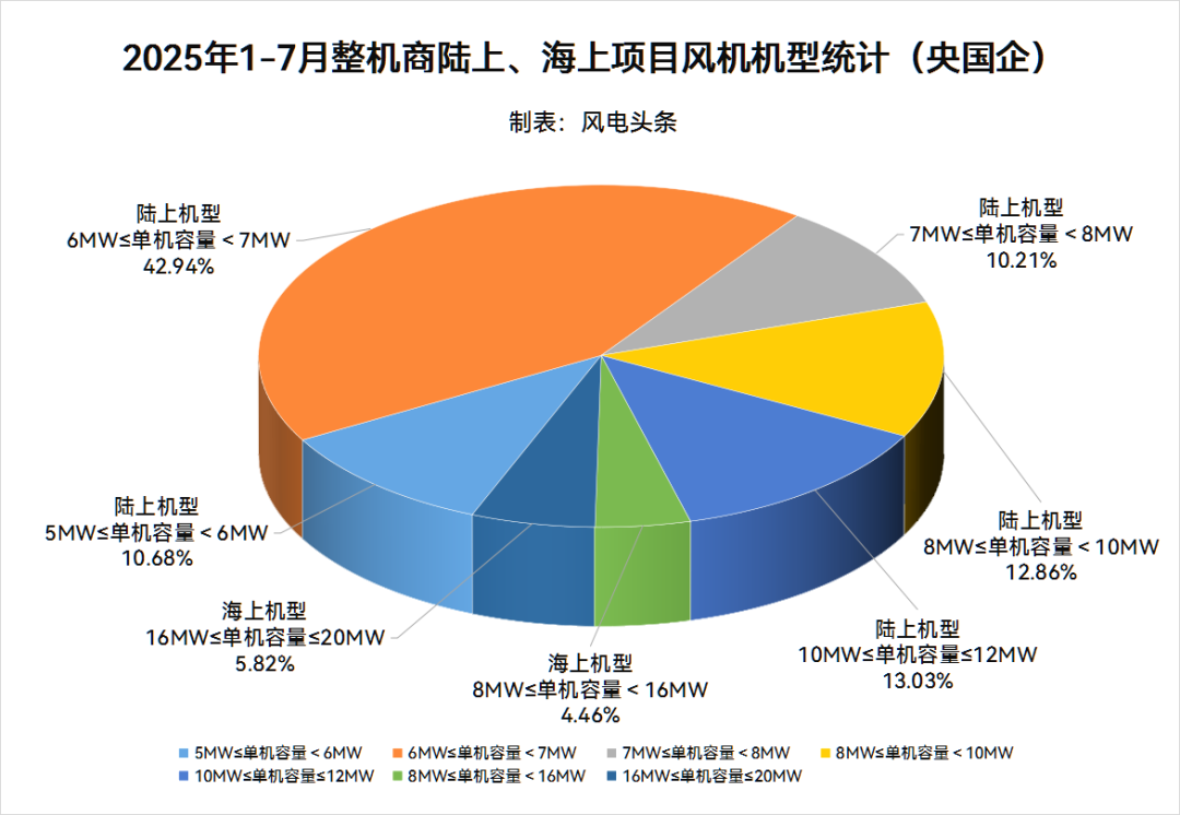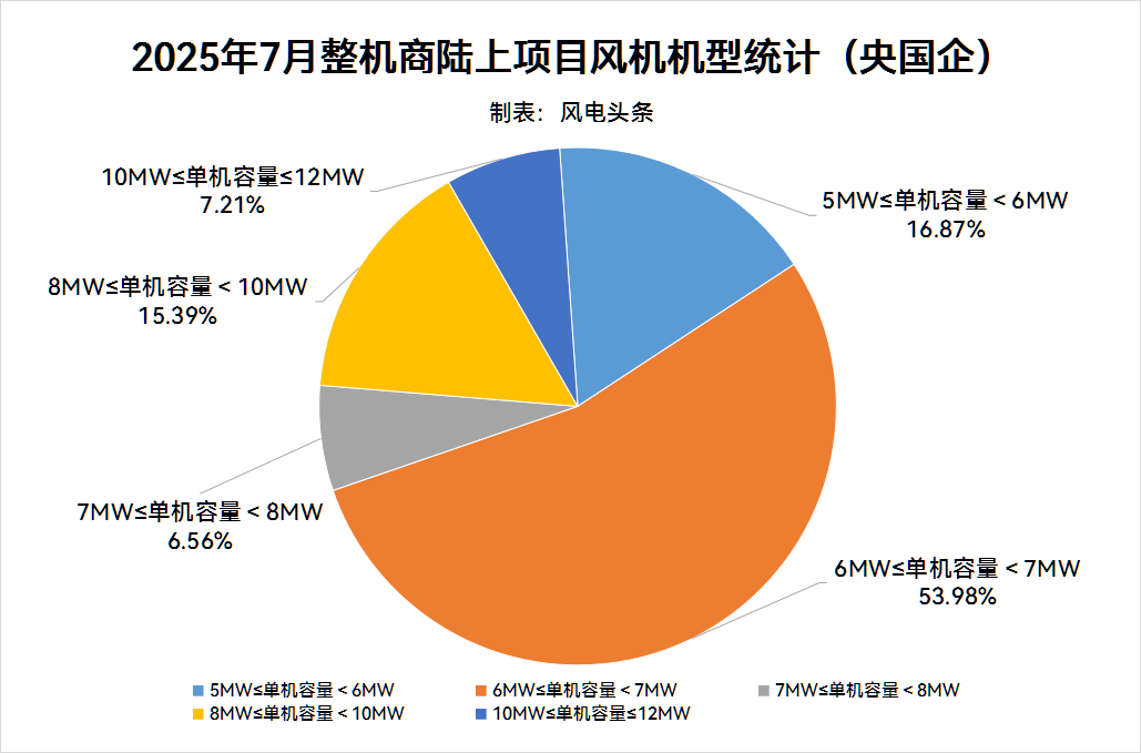新能源圈通过梳理2025年7月风电项目所中标机型发现,央国企陆上风电项目中,6MW≤单机容量<7MW占比最大,达53.98%,其次是5MW≤单机容量<6MW、8MW≤单机容量<10MW,占比均超15%。(仅统计有规模及招标机型的项目、7月无海上风电项目开标)