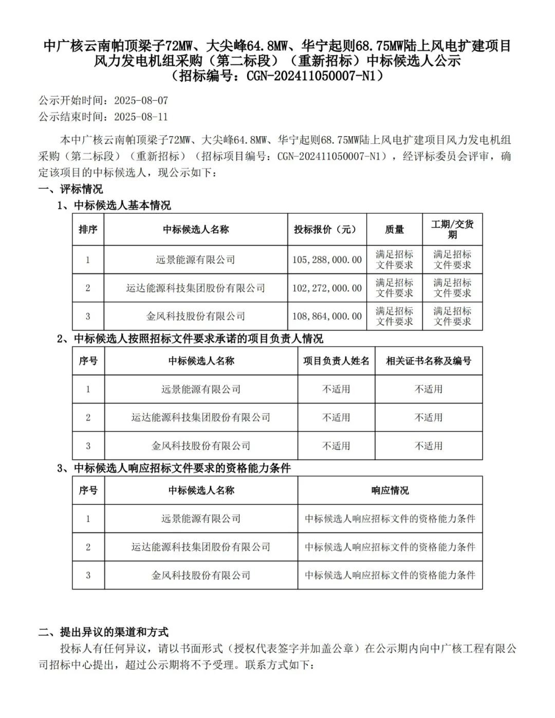 新能源圈获悉,8月7日,中广核云南帕顶梁子72MW、大尖峰64.8MW、华宁起则68.75MW陆上风电扩建项目风力发电机组采购(第二标段)(重新招标)中标候选人公示,项目规模为64.8MW,单机容量5000kW及以上。