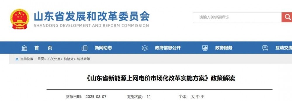 8月7日,山东省发展改革委公布关于印发《山东省新能源上网电价市场化改革实施方案》的通知(鲁发改价格〔2025〕576号)。