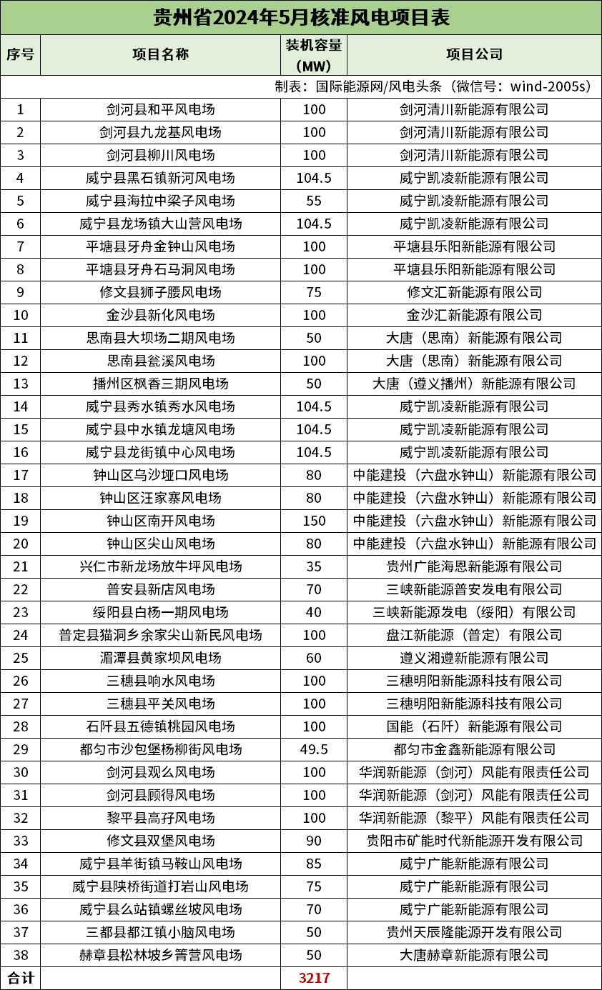 贵州核准38个风电项目,总规模3217MW,均为陆上风电项目。