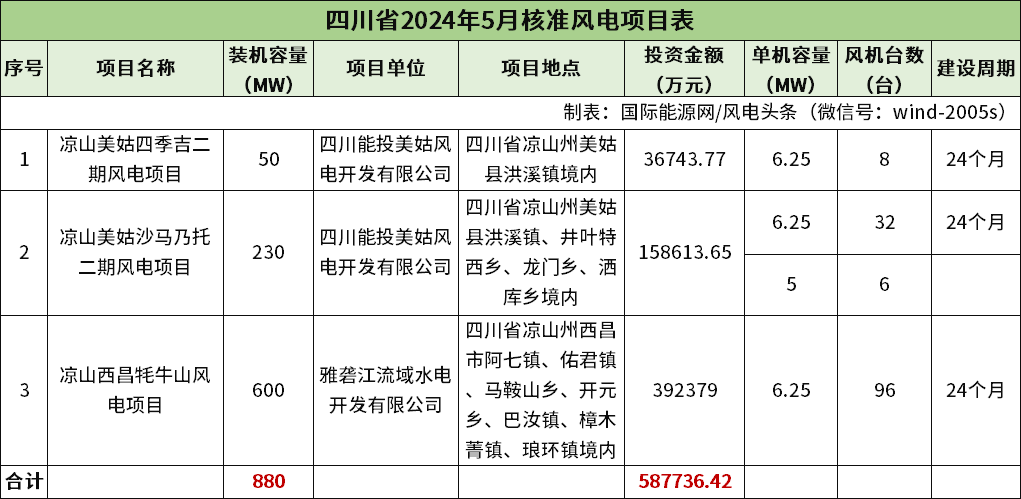 四川核准3个风电项目,总规模880MW,总投资587736.42万元,均为陆上风电项目。