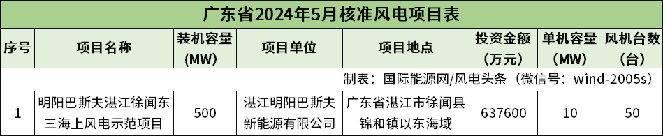 广东核准1个风电项目,总规模500MW,总投资637600万元,为海上风电项目。