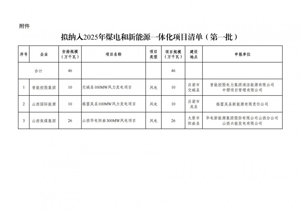 关于山西省2025年煤电和新能源一体化项目评审结果的公示(第一批)