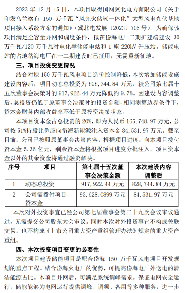 公告称,本次公司拟按照电网接入系统方案的要求,在本项目原有风电项目建设内容的基础上新增建设30万千瓦/120万千瓦时电化学储能设施,项目总投资变更为828,744.84万元,较公司第七届十五次董事会决策时的917,922.44万元降低约9.7%。储能电站的占地岱海电厂在一二期建设时已征用,无需重新征地。