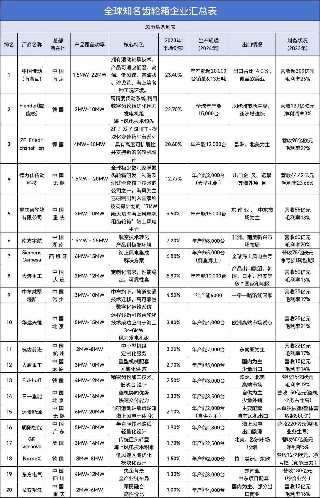 德国的两家齿轮箱厂商威能极和采埃孚的市场占有率分别为22.7%和20.6%,国内外头部齿轮箱企业的市场集中度相当高。