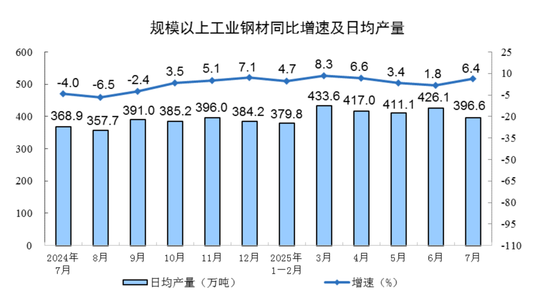 分产品看,7月份,规模以上工业623种产品中有335种产品产量同比增长。其中,钢材12295万吨,同比增长6.4%;水泥14557万吨,下降5.6%;十种有色金属681万吨,增长2.2%;乙烯312万吨,增长9.1%;汽车251.0万辆,增长8.4%,其中新能源汽车117.6万辆,增长17.1%;发电量9267亿千瓦时,增长3.1%;原油加工量6306万吨,增长8.9%。