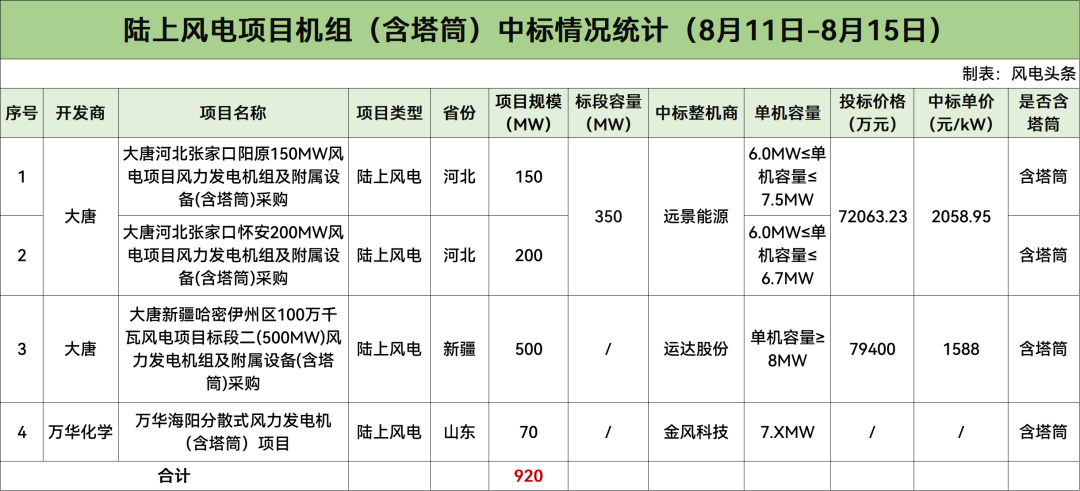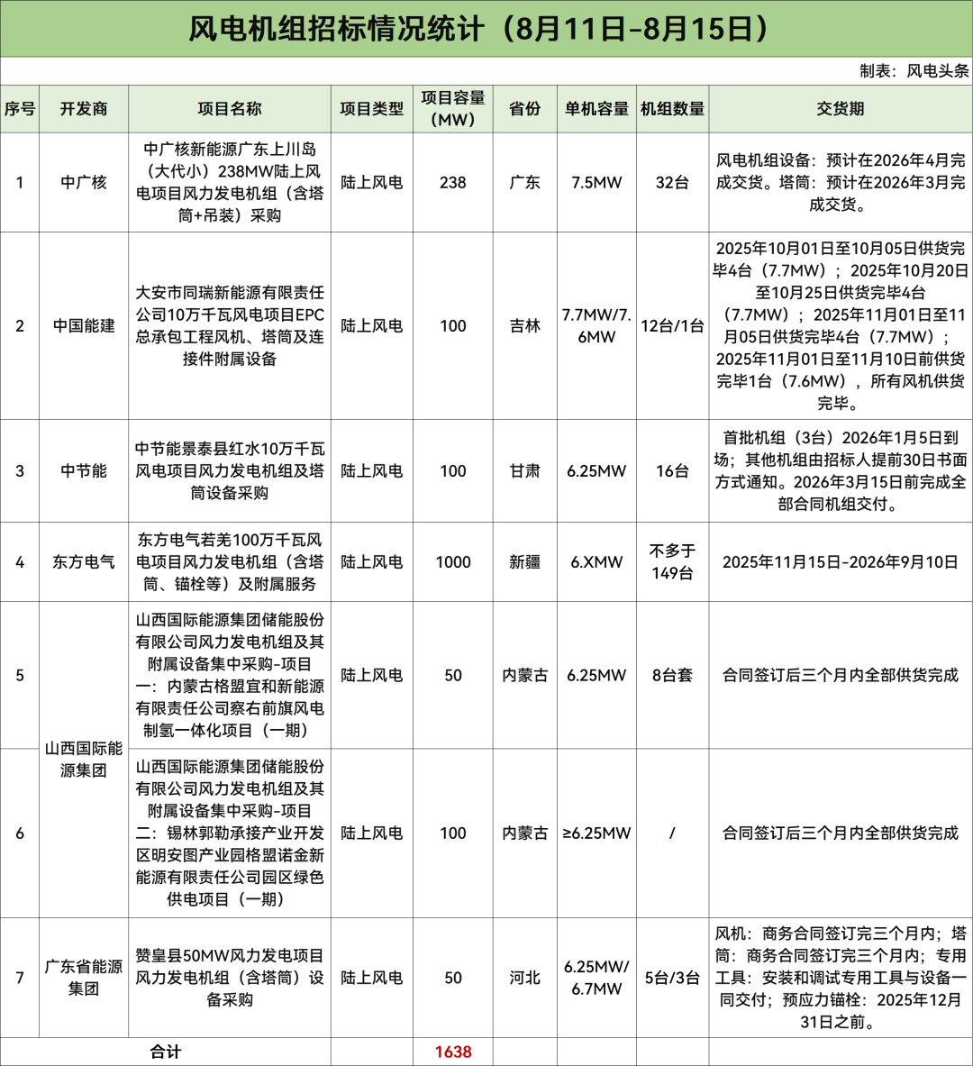 据新能源圈统计,8月11日-8月15日风电整机采购开标总计2101.25MW,风电机组招标总计1638MW;风电塔筒开标总计987.5MW,风电塔筒招标总计615MW。