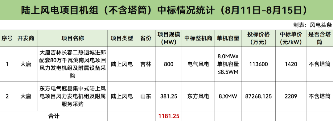 大唐开标2031.25MW,电气风电中标800MW,运达股份中标500MW,东方风电中标381.25MW,远景能源中标350MW。
