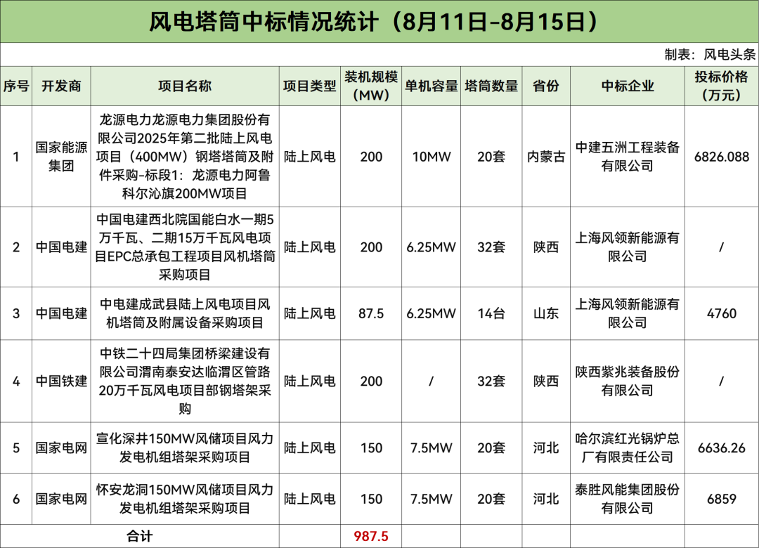 据新能源圈统计,本周有6个陆上风电项目塔筒采购开标,规模为987.5MW,开发商为国家能源集团、中国电建、中国铁建、国家电网。