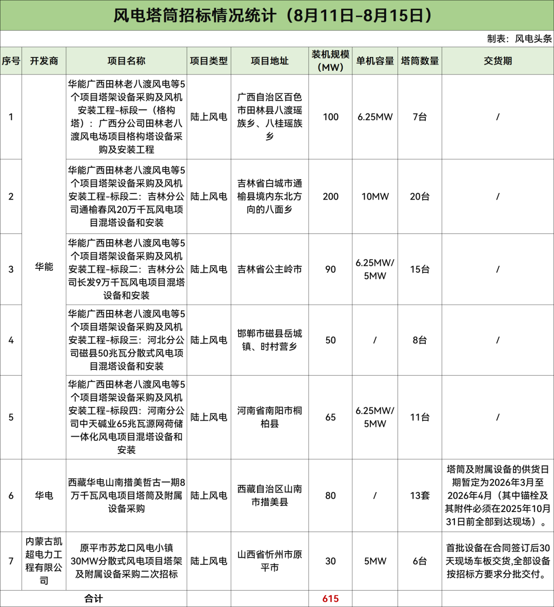 据新能源圈统计,本周风电塔筒招标市场方面,共7个陆上风电项目615MW塔筒启动采购,开发商是华能、华电、内蒙古凯超电力工程有限公司。