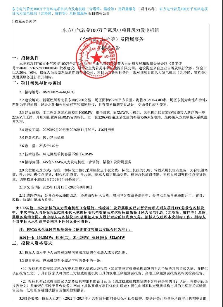 东方电气若羌100万千瓦风电项目,计划采购风机(含塔筒)不超过149台,预计交货时间是2025年11月15日-2026年9月10日,项目不接受联合体投标,截止时间为9月4日11点。