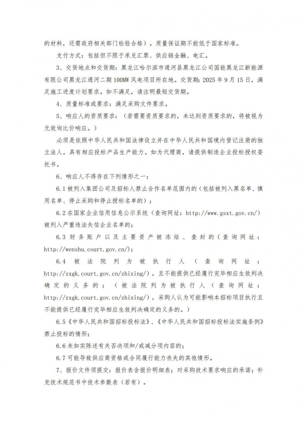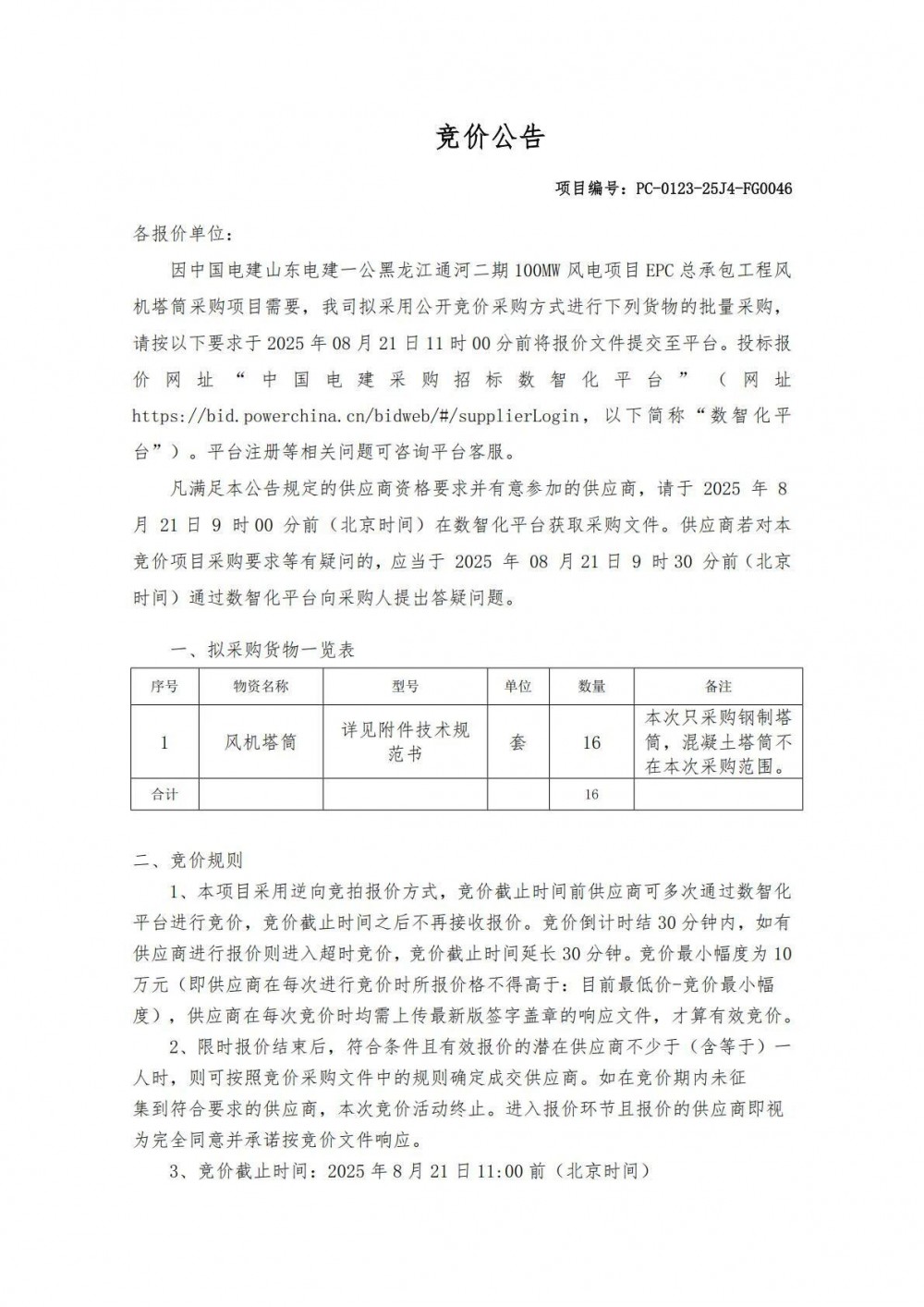黑龙江通河二期100MW风电项目,计划采购塔筒16台,预计交货时间是2025年9月15日,项目采取竞价方式进行,截止时间为8月21日11点。