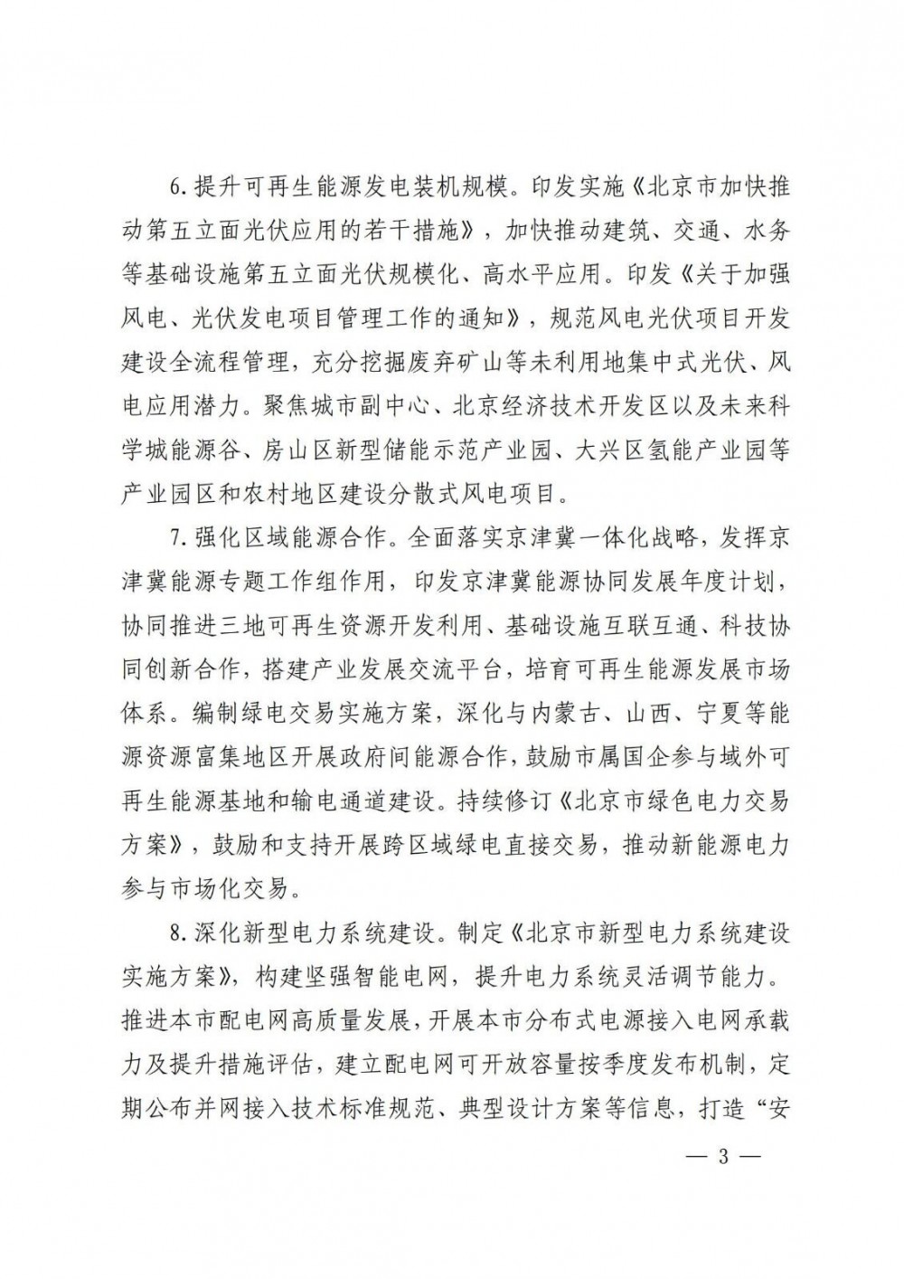 内容指出,提升可再生能源发电装机规模。印发实施《北京市加快推动第五立面光伏应用的若干措施》,加快推动建筑、交通、水务等基础设施第五立面光伏规模化、高水平应用。印发《关于加强风电、光伏发电项目管理工作的通知》,规范风电光伏项目开发建设全流程管理,充分挖掘废弃矿山等未利用地集中式光伏、风电应用潜力。聚焦城市副中心、北京经济技术开发区以及未来科学城能源谷、房山区新型储能示范产业园、大兴区氢能产业园等产业园区和农村地区建设分散式风电项目。