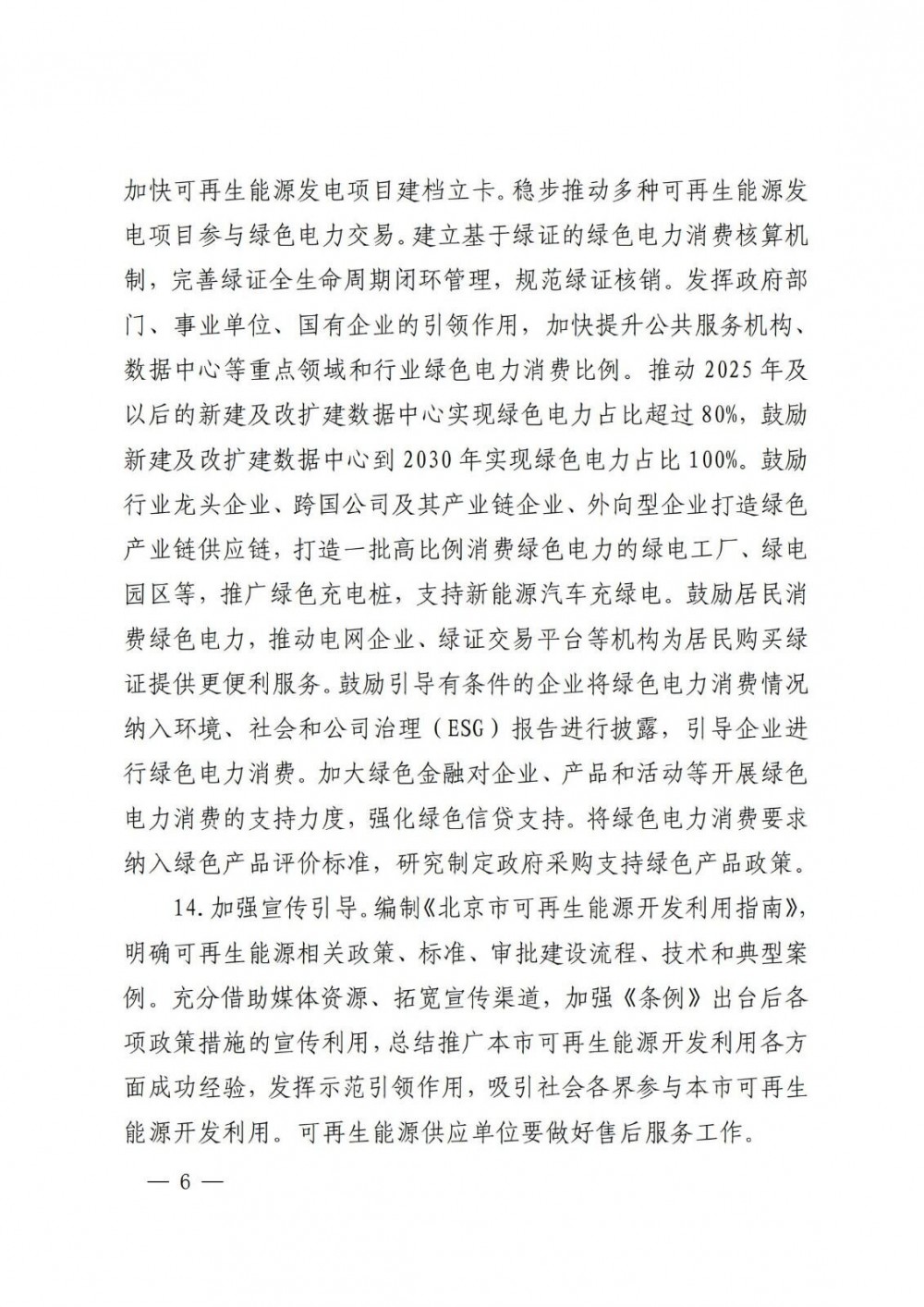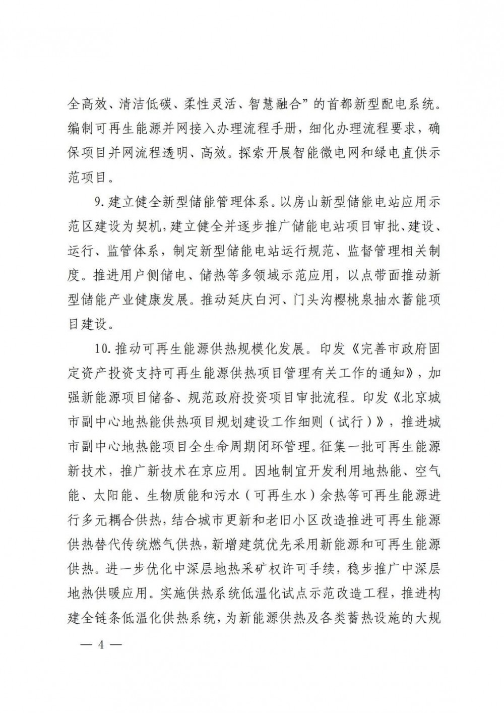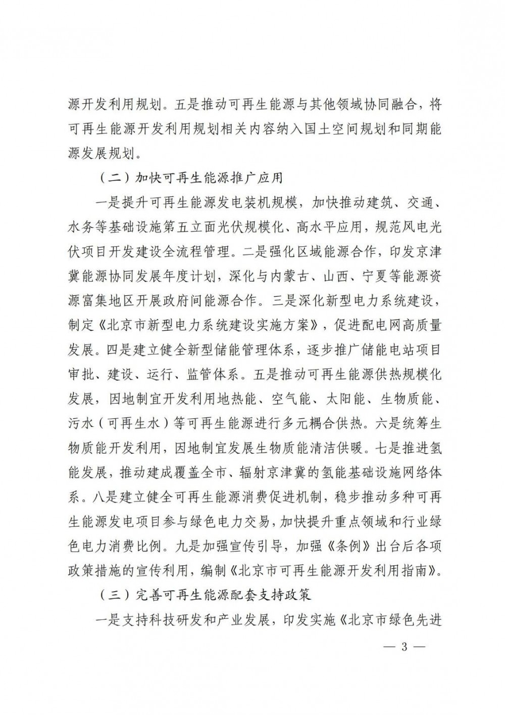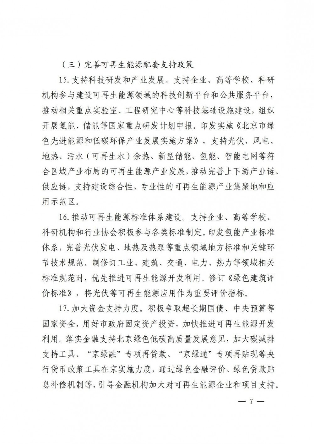 印发实施《北京市绿色先进能源和低碳环保产业发展实施方案》,支持光伏、风电、地热、污水(可再生水)余热、新型储能、氢能、智能电网等符合区域产业布局的可再生能源产业发展,推动完善上下游产业链、供应链,支持建设综合性、专业性的可再生能源产业集聚地和应用示范区。