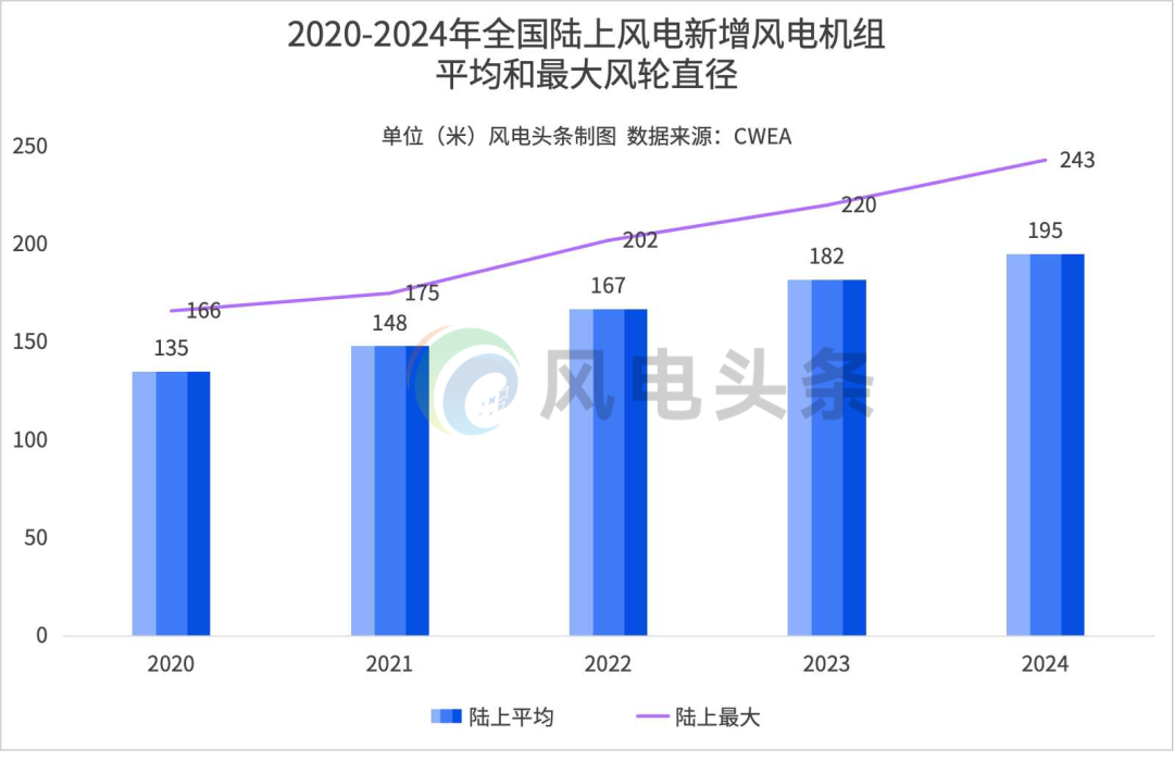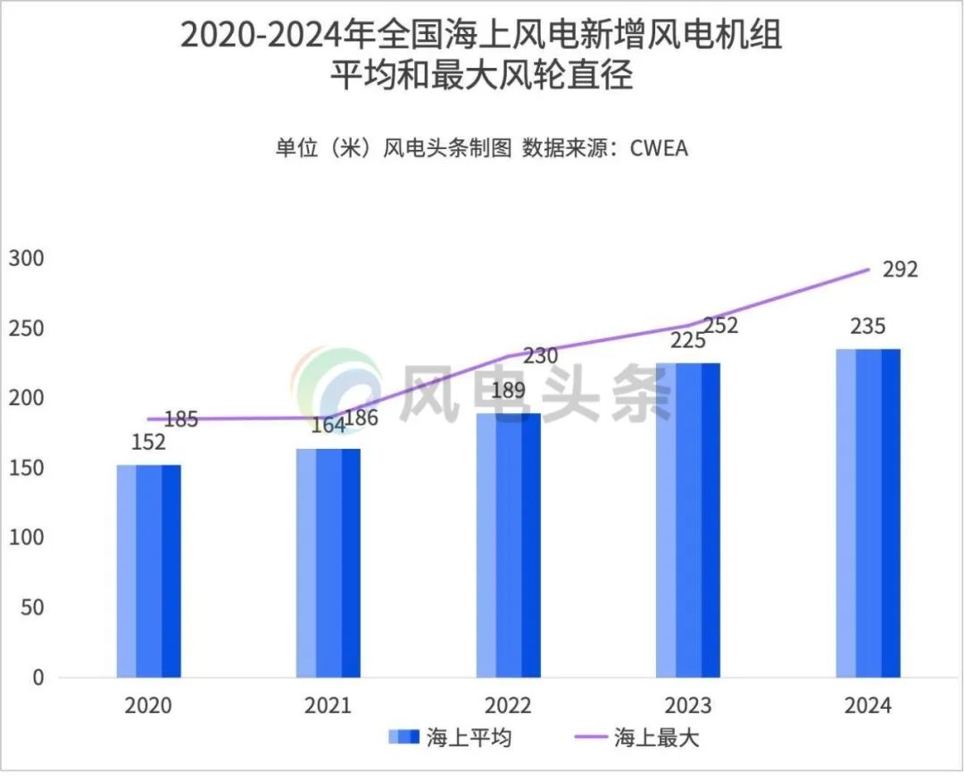 《中国风电产业地图》数据显示,2024年,200米及以上的风轮直径机组装机占比达50%,比2023年提高约30个百分点。陆上风电平均风轮直径从2020年的135米提高到2024年的195米;海上风电风轮直径从2020年平均152米提高到2024年的平均235米。
