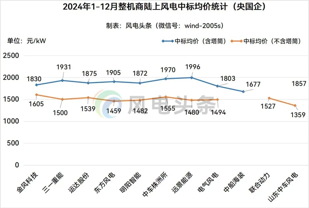 国能能源研究院不完全统计,2024年,央国企陆上风电项目(含塔筒)中标均价为1894元/千瓦,陆上风电项目(不含塔筒)中标均价为1513元/千瓦。海上风电项目(含塔筒)中标均价为3307元/千瓦,海上风电项目(不含塔筒)中标均价为2698元/千瓦。