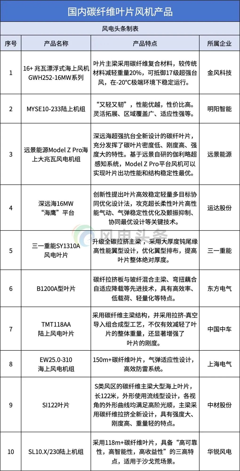国内风电设备厂商近年来也在推出碳纤维的风机叶片产品,包括远景能源、金风科技、明阳智能、三一重能、电气风电等在内的多家风电企业已经推出了自己的碳纤维叶片的风机产品。