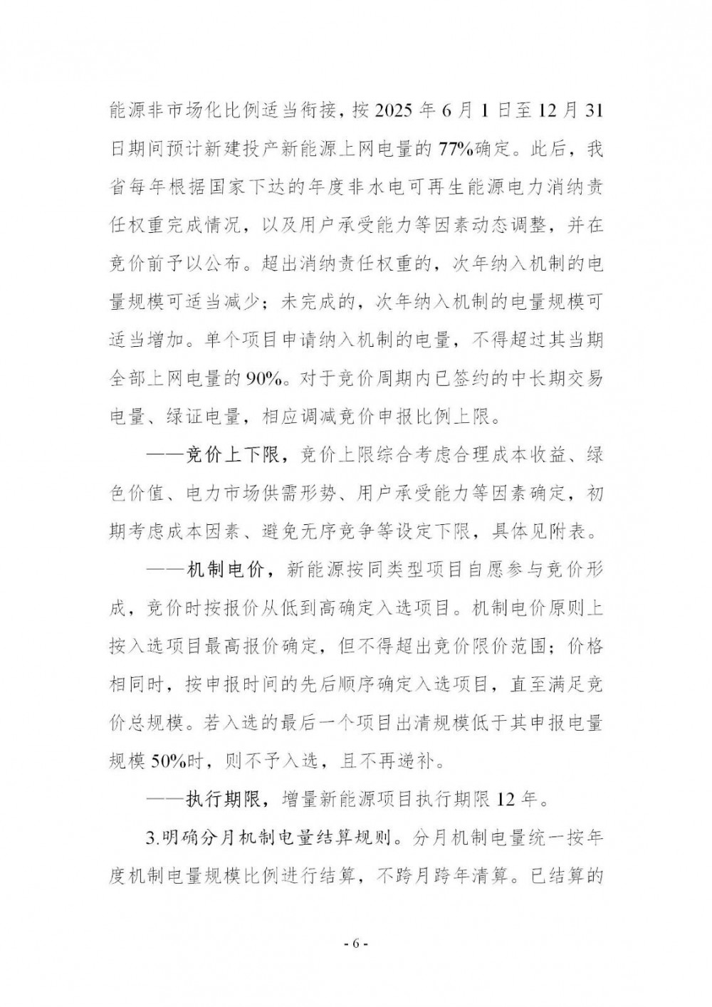 电量规模,2025年首次竞价电量规模与2024年新能源非市场化比例适当衔接,按2025年6月1日至12月31日期间预计新建投产新能源上网电量的77%确定。此后,我省每年根据国家下达的年度非水电可再生能源电力消纳责任权重完成情况,以及用户承受能力等因素动态调整,并在竞价前予以公布。超出消纳责任权重的,次年纳入机制的电量规模可适当减少;未完成的,次年纳入机制的电量规模可适当增加。单个项目申请纳入机制的电量,不得超过其当期全部上网电量的90%。对于竞价周期内已签约的中长期交易电量、绿证电量,相应调减竞价申报比例上限。