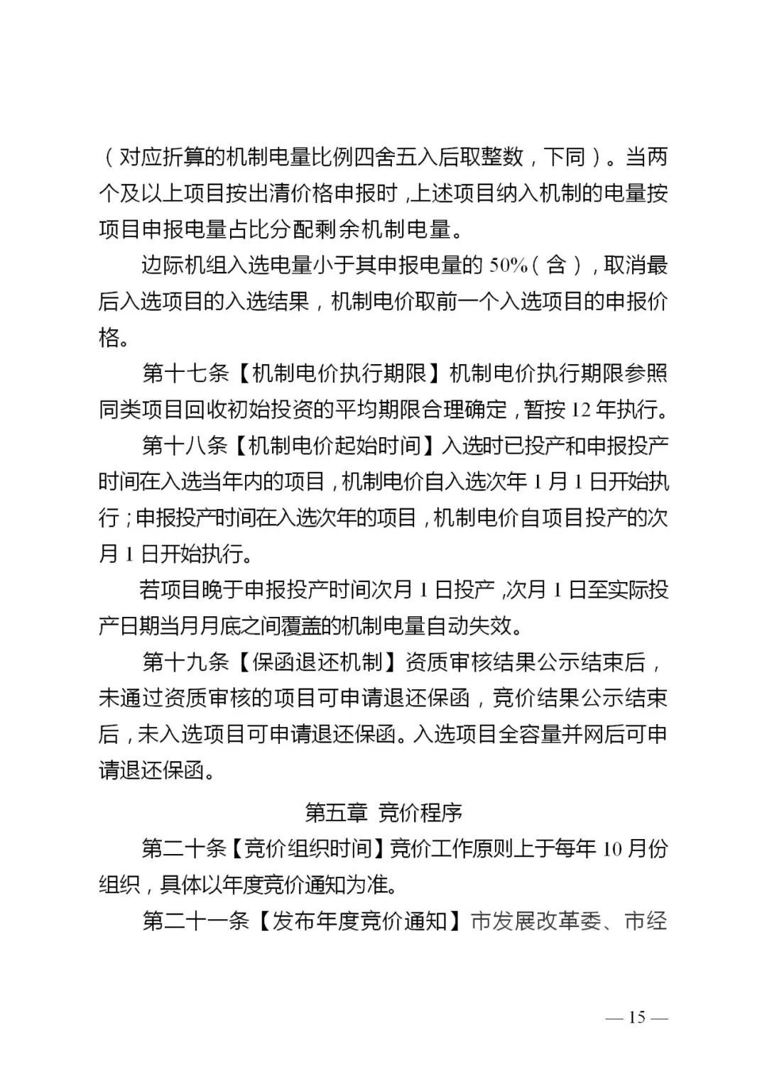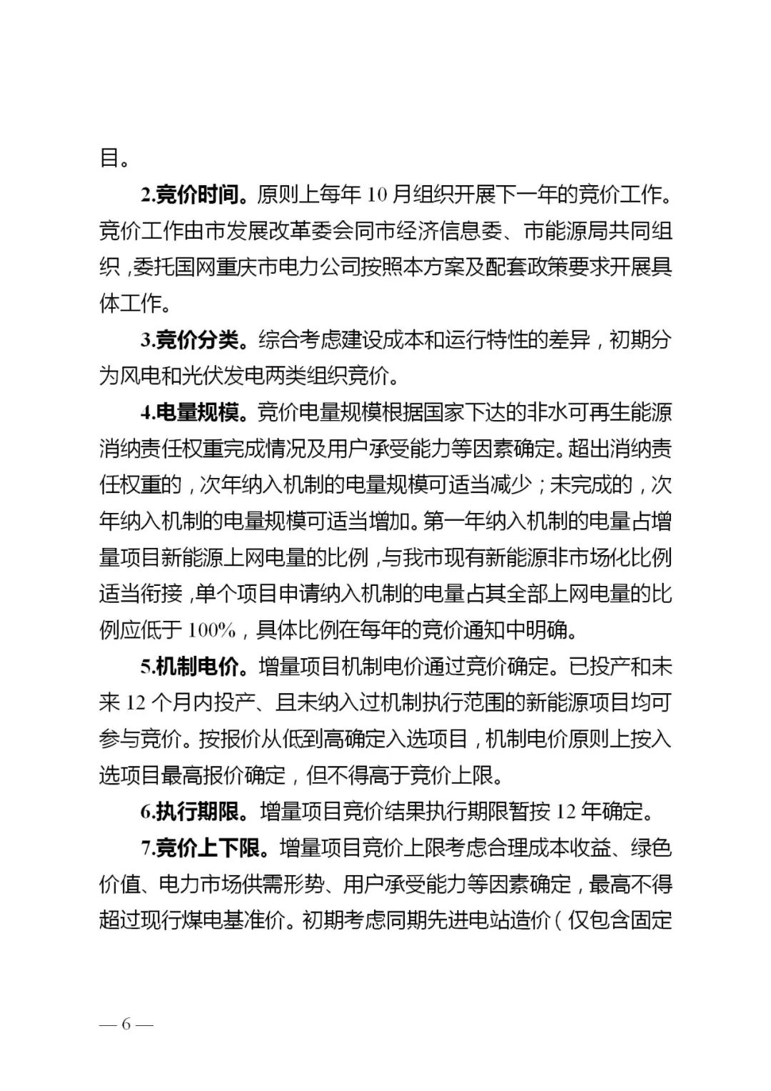 5.机制电价。增量项目机制电价通过竞价确定。已投产和未来12个月内投产、且未纳入过机制执行范围的新能源项目均可参与竞价。按报价从低到高确定入选项目,机制电价原则上按入选项目最高报价确定,但不得高于竞价上限。