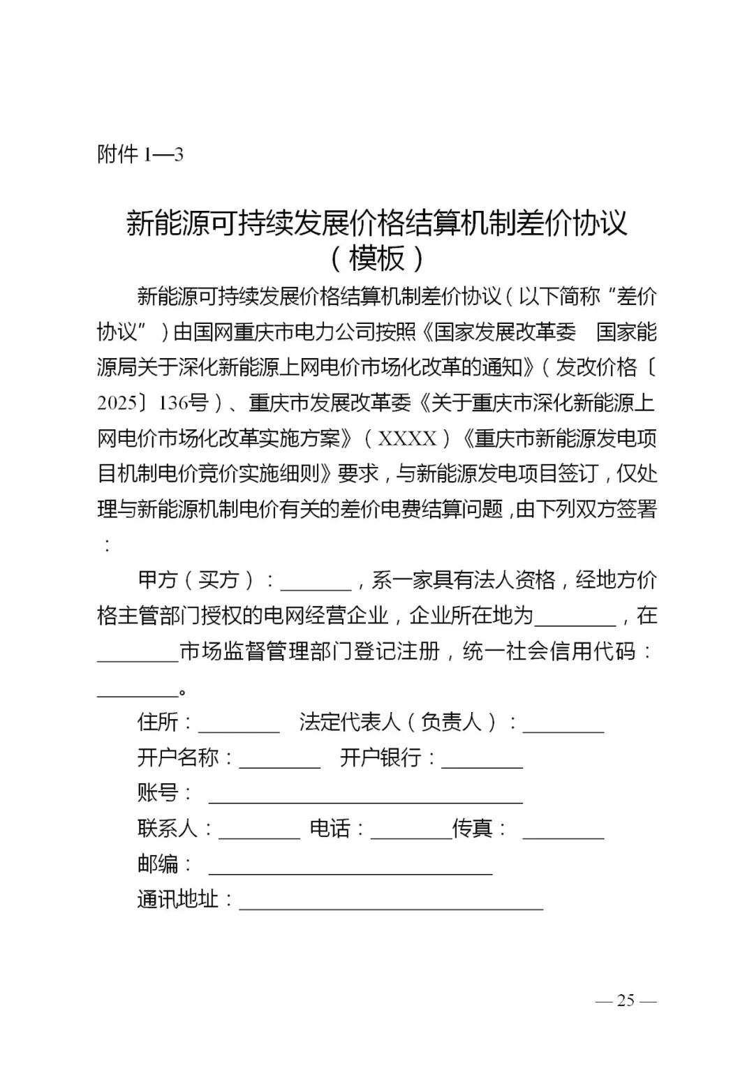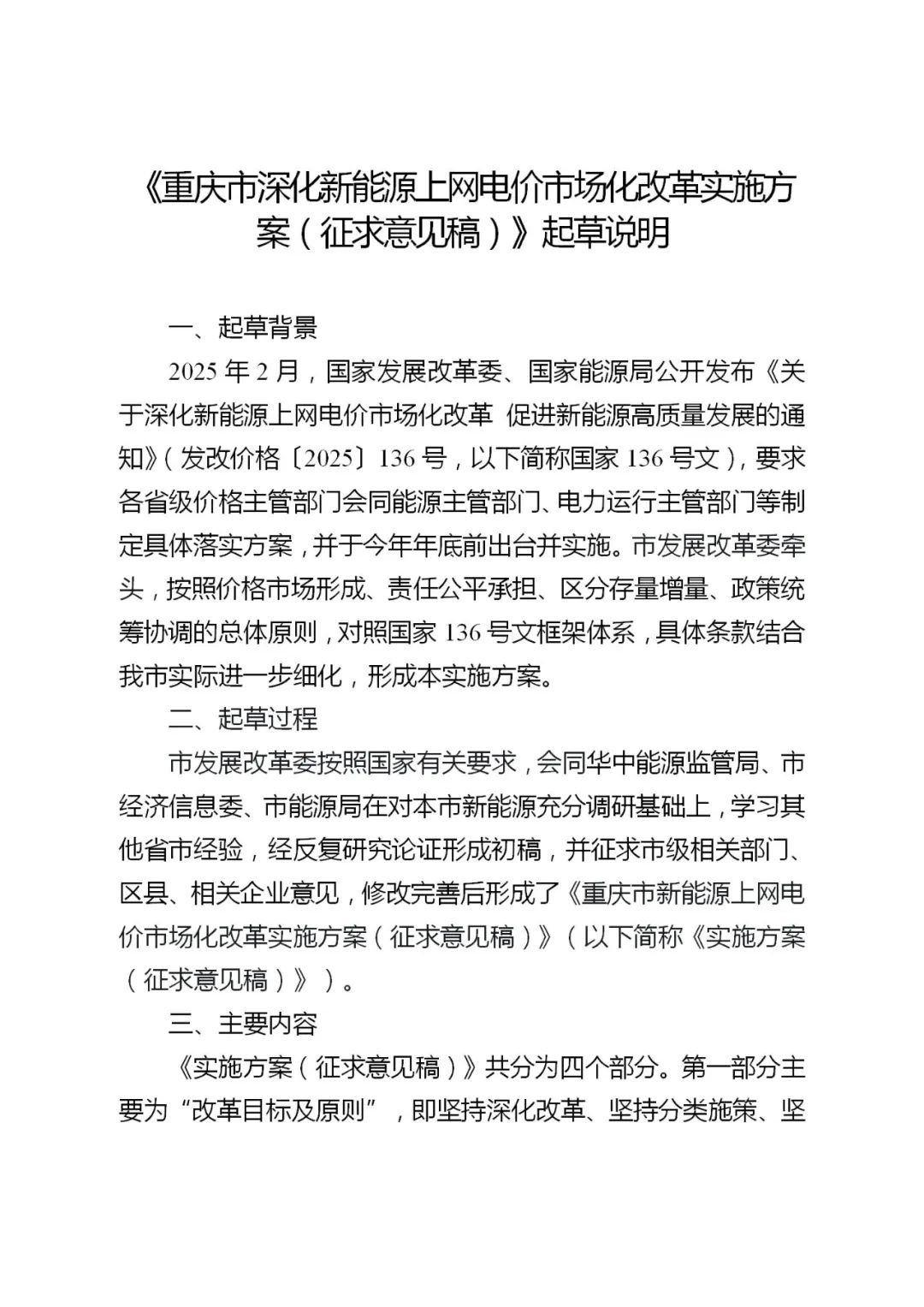 为加快构建新型电力系统、健全绿色低碳发展机制,根据国家发展改革委、国家能源局《关于深化新能源上网电价市场化改革 促进新能源高质量发展的通知》(发改价格〔2025〕136号)相关要求,结合我市实际,我委牵头起草了《重庆市深化新能源上网电价市场化改革实施方案(征求意见稿)》。现面向社会公开征求意见。