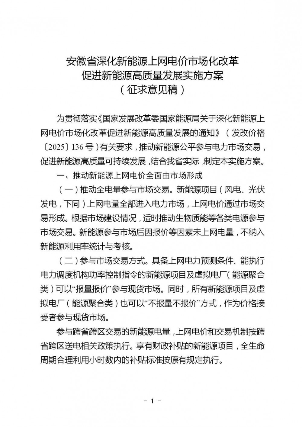 附件:1.附件1:安徽省深化新能源上网电价市场化改革促进新能源高质量发展实施方案(征求意见稿).doc