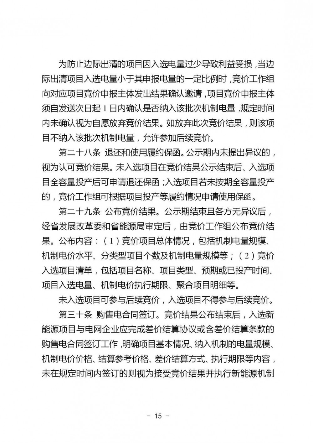 (2)机制电价:每年组织具备条件的新能源项目自愿参与竞价,竞价分类方式根据新能源发展情况确定。竞价时按报价从低到高的原则确定入选项目,机制电价原则上按入选项目最高报价确定、但不得高于竞价上限。考虑合理成本收益、绿色价值、电力市场供需形势、用户承受能力等因素,确定竞价上下限。