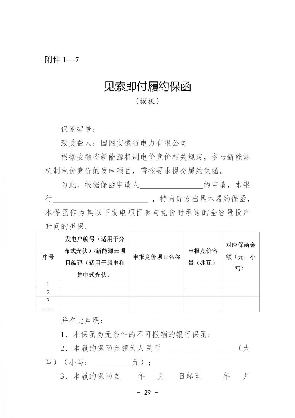 资质审核通过的未投产项目应向竞价工作组提交履约保函,其中分布式新能源聚合商按代理未投产项目容量提交履约保函。保函金额应不低于项目装机容量、该类电源年合理利用小时(光伏1100小时、风电1800小时)、安徽省燃煤发电基准价(0.3844元/千瓦时)三者乘积的5%,保函自项目申报投产日期起生效,有效期至少9个月。
