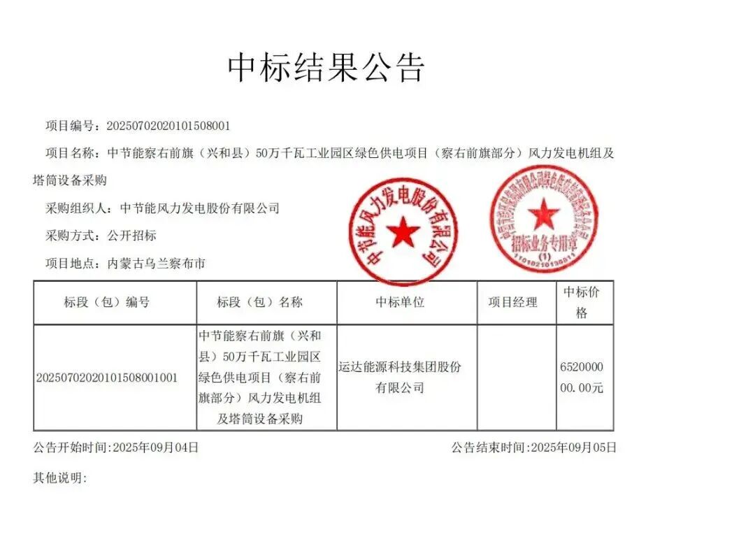 运达股份报价65200万,中标中节能察右前旗(兴和县)50万千瓦工业园区绿色供电项目(察右前旗部分),中标风机和配套设备40台,中标单价1630元/kW。首批机组(3台)2026年6月15日到场;其他机组由招标人提前30日书面方式通知。 2026年10月31日前完成全部合同机组交付。