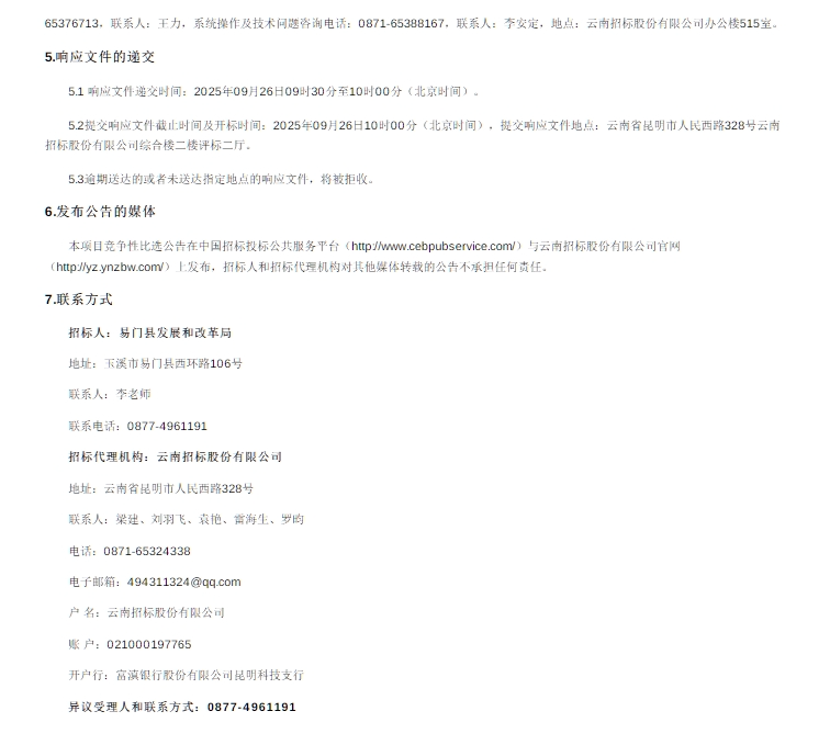 工期要求:取得项目开发权后1个月内启动前期工作;6个月内完成项目核准,取得核准后3个月内开工,原则上开工后1年具备投产条件,18个月实现全容量并网。因自身原因逾期未完成的责令限期整改,整改期满仍未开工建设的,无偿收回开发权,项目业主两年内不得参与易门县新能源开发建设。