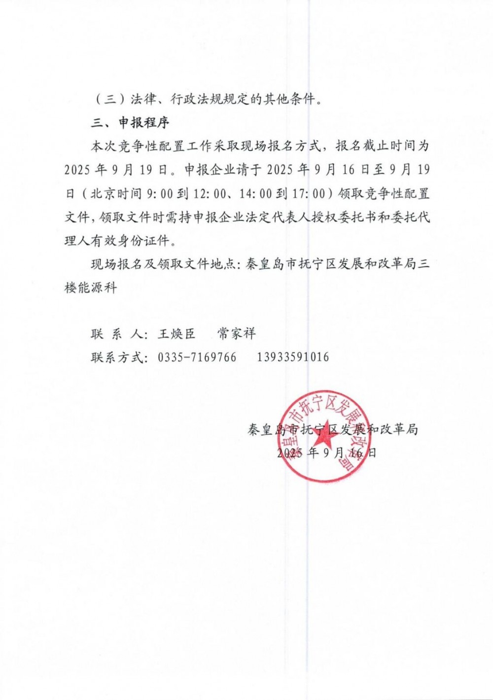 本次竞争性配置工作采取现场报名方式,报名截止时间为2025年9月19日。