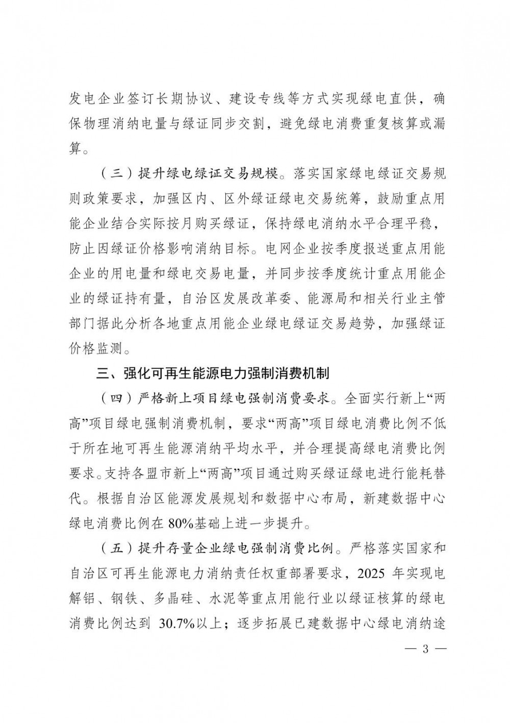 提升存量企业绿电强制消费比例。严格落实国家和自治区可再生能源电力消纳责任权重部署要求,2025年实现电解铝、钢铁、多晶硅、水泥等重点用能行业以绿证核算的绿电消费比例达到30.7%以上;逐步拓展已建数据中心绿电消纳途径,力争绿电消费比例达到60%以上,鼓励其实现100%绿电消费。进一步提升有色、建材、化工等行业企业的绿电消费比例,原则上不低于自治区可再生能源电力总量消纳责任权重平均水平。鼓励各类用能企业主动开展绿电消费认定。