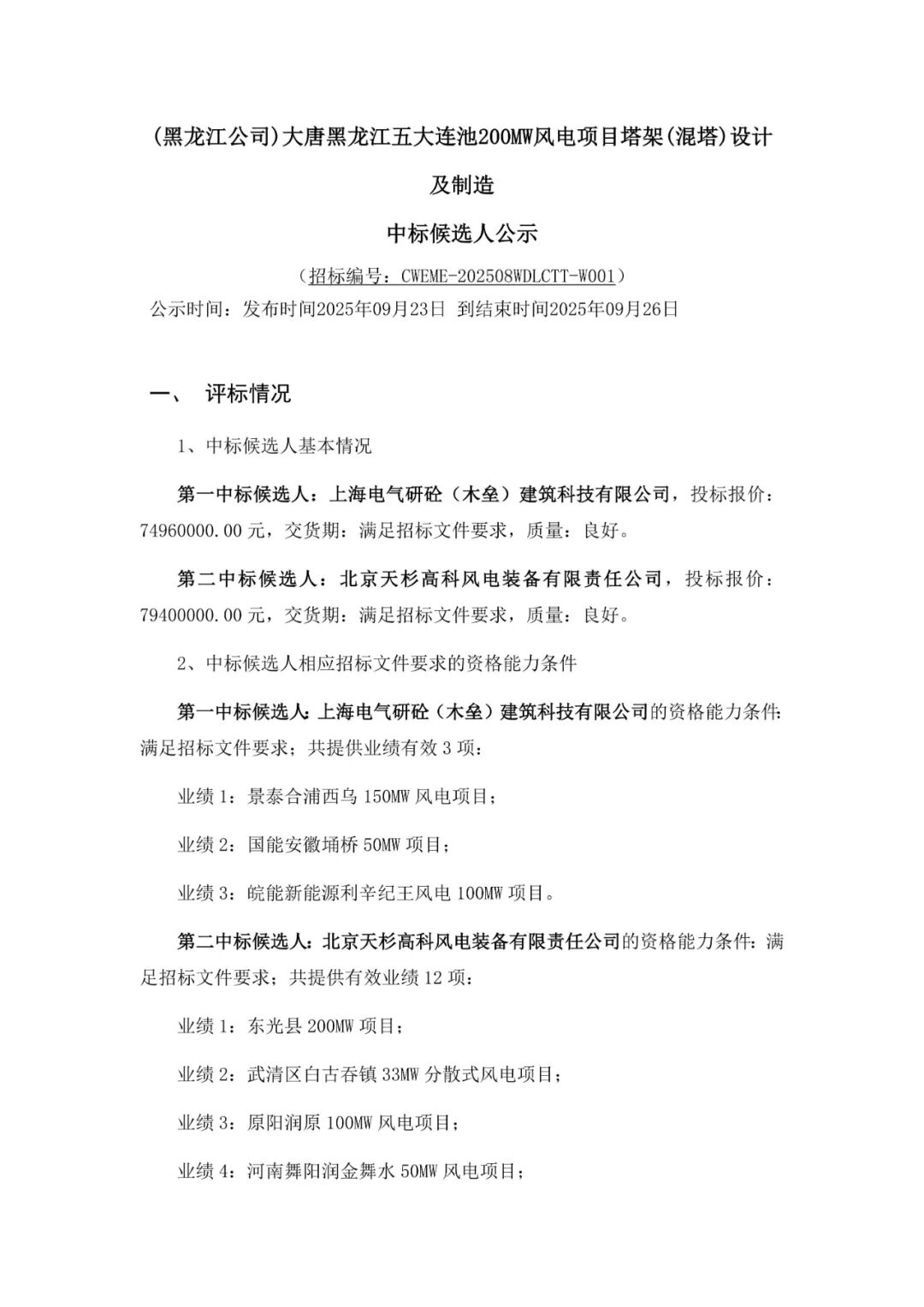 根据公示,上海电气风电集团股份有限公司、上海电气研砼(木垒)建筑科技有限公司、北京天杉高科风电装备有限责任公司作为第一中标候选人预中标。