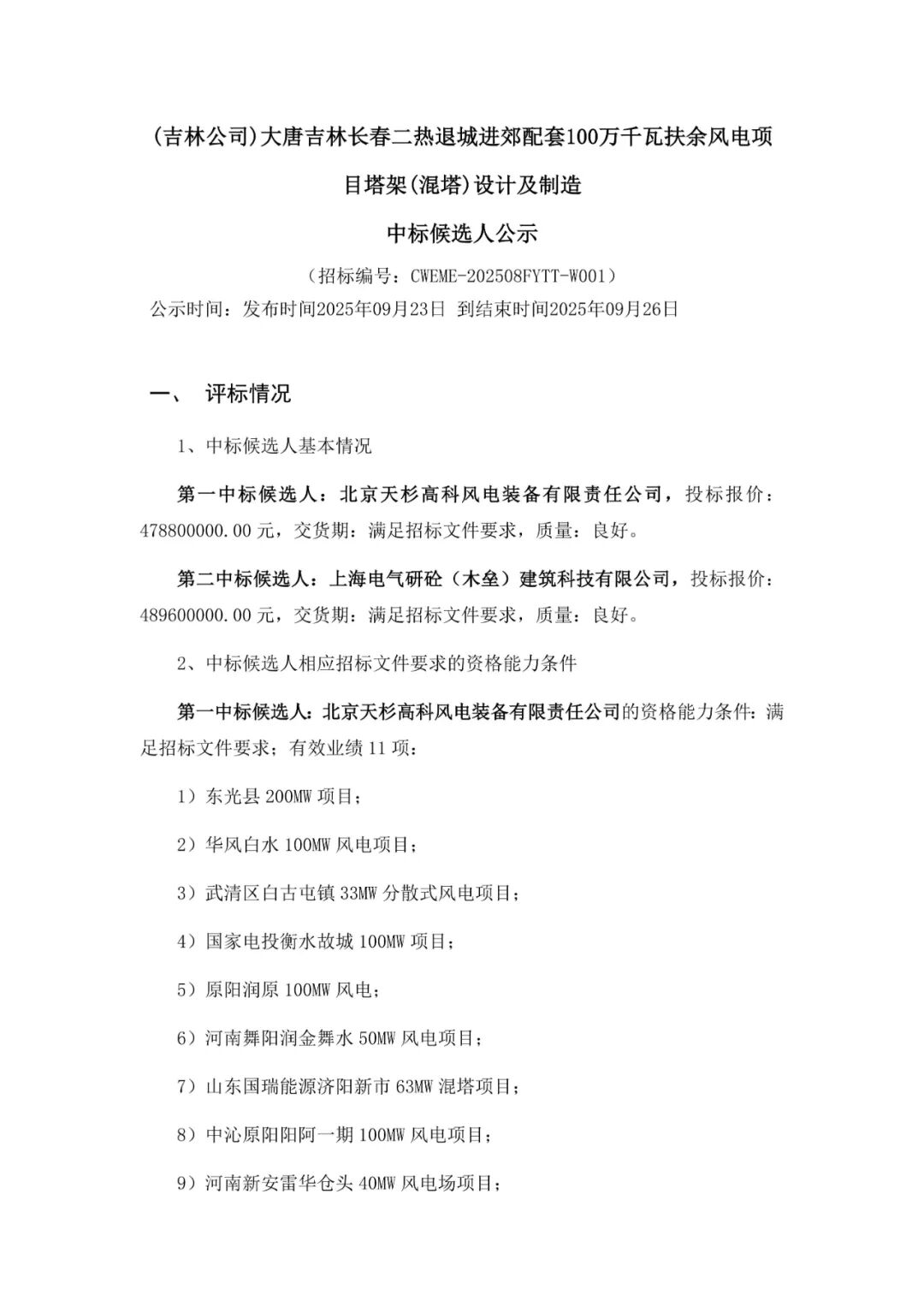 新能源圈获悉,9月23日,大唐山东沾化风光同场一期105MW风电新建项目、大唐黑龙江五大连池200MW风电项目、大唐吉林长春二热退城进郊配套100万千瓦扶余风电项目塔架(混塔)设计及制造中标候选人公示,规模合计1305MW。