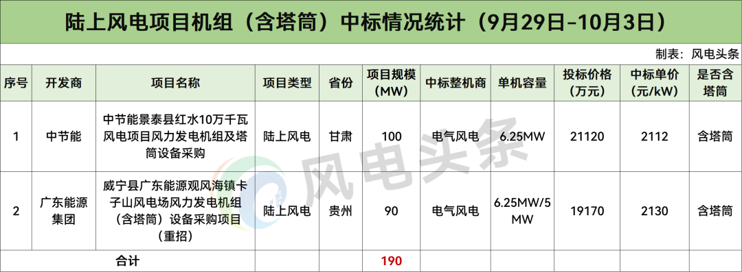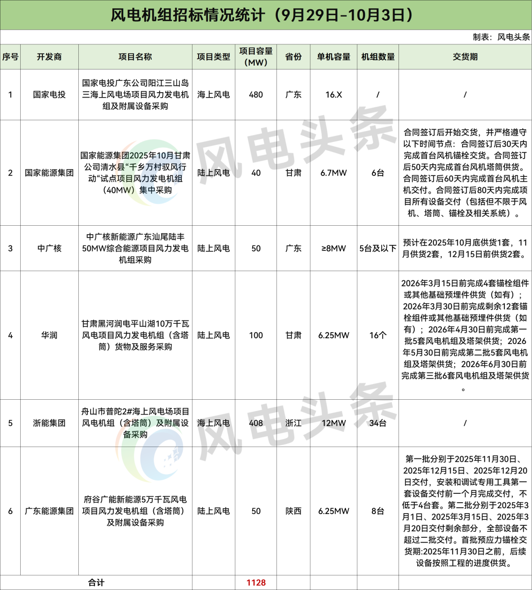 据新能源圈统计,9月29日-10月3日风电整机采购开标总计630MW,风电机组招标总计1128MW;风电塔筒招标总计800MW。
