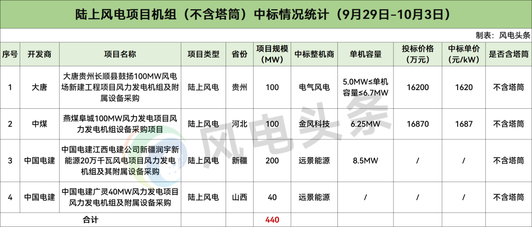 最高中标单价为1687元/kW,项目为燕煤阜城100MW风力发电项目,由金风科技报出。最低中标单价为1620元/kW,项目为大唐贵州长顺县鼓扬100MW风电场新建工程项目,由电气风电报出。