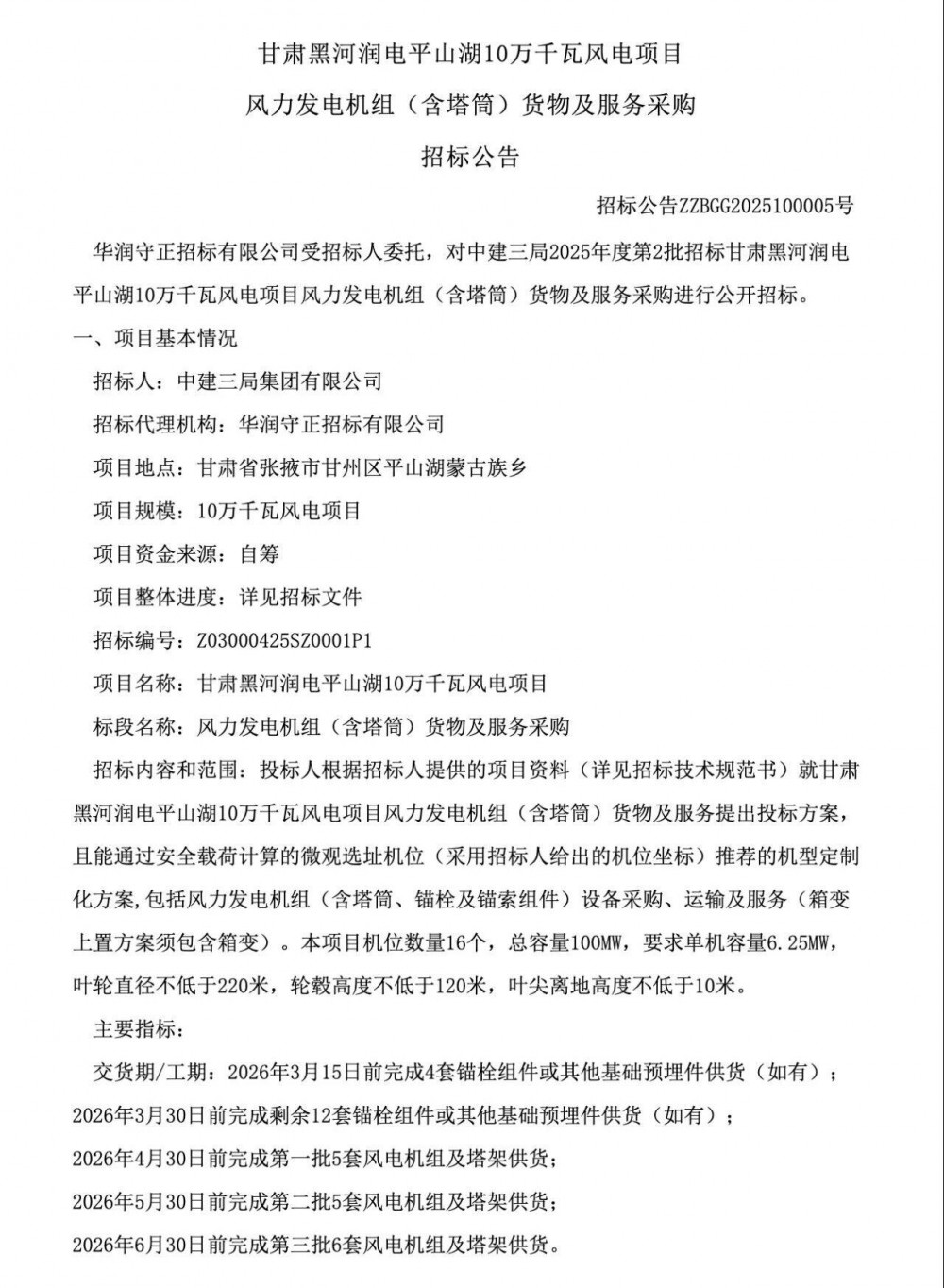 新能源圈获悉,近日中国招标投标电子商务平台发布三条招标信息。根据招标文件显示,三个项目合计规模400MW,涉及52台风机招标。 三个项目分别位于黑龙江五大连池、甘肃张掖和陕西榆林。 三个项目中,黑龙江五大连池的风电项目涉及总承包工程的招标,甘肃黑河润电平山湖10万千瓦风电项目,主要是风电机组(含塔筒)采购,陕西榆林的中国电建横山10万千瓦风电项目,则涉及混合塔筒和附属设备采购。