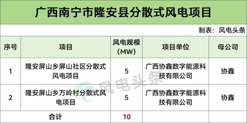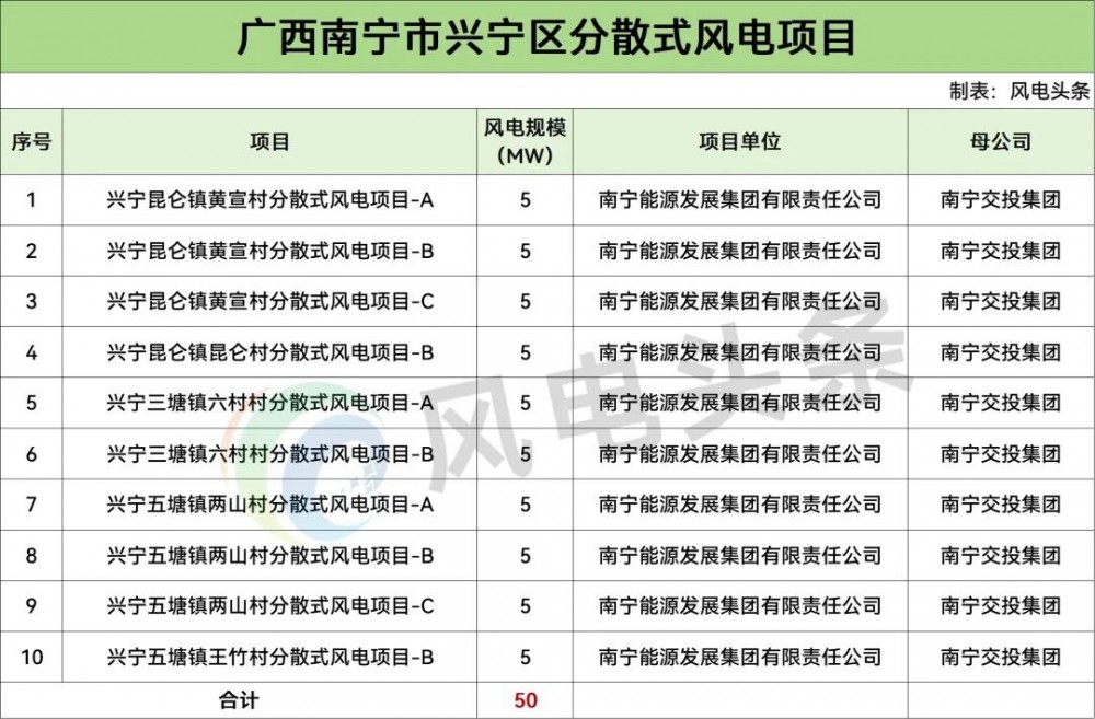9 月 1 日,广西南宁市兴宁区公示 2025 年分散式风电建设项目,拟建设兴宁昆仑镇黄宣村分散式风电项目 - A 等 10 个项目,总容量 50MW,已纳入《南宁市分散式风电规划项目清单》。