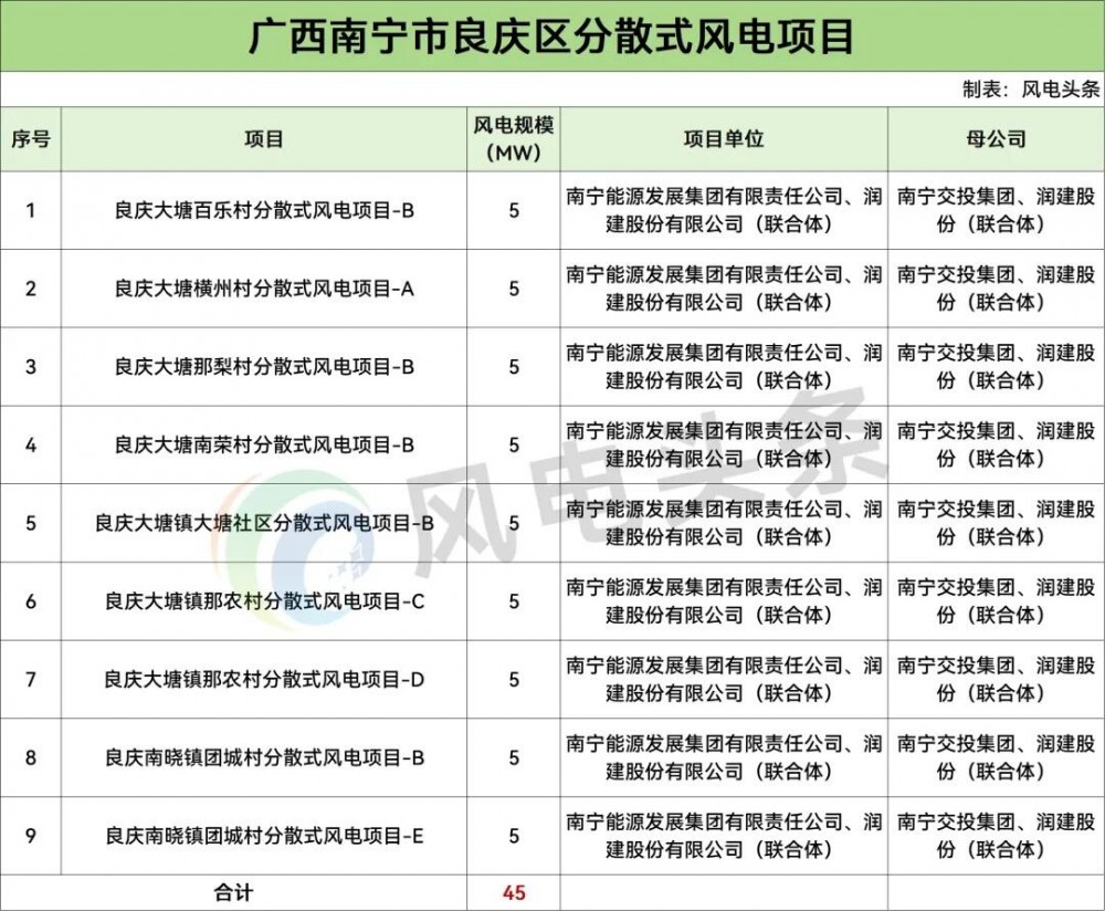 8 月 29 日,广西南宁市良庆区公示 2025 年分散式风电建设项目,拟建设良庆大塘百乐村分散式风电项目 - B 等 9 个项目,总容量 45MW,已纳入《南宁市分散式风电规划项目清单》。