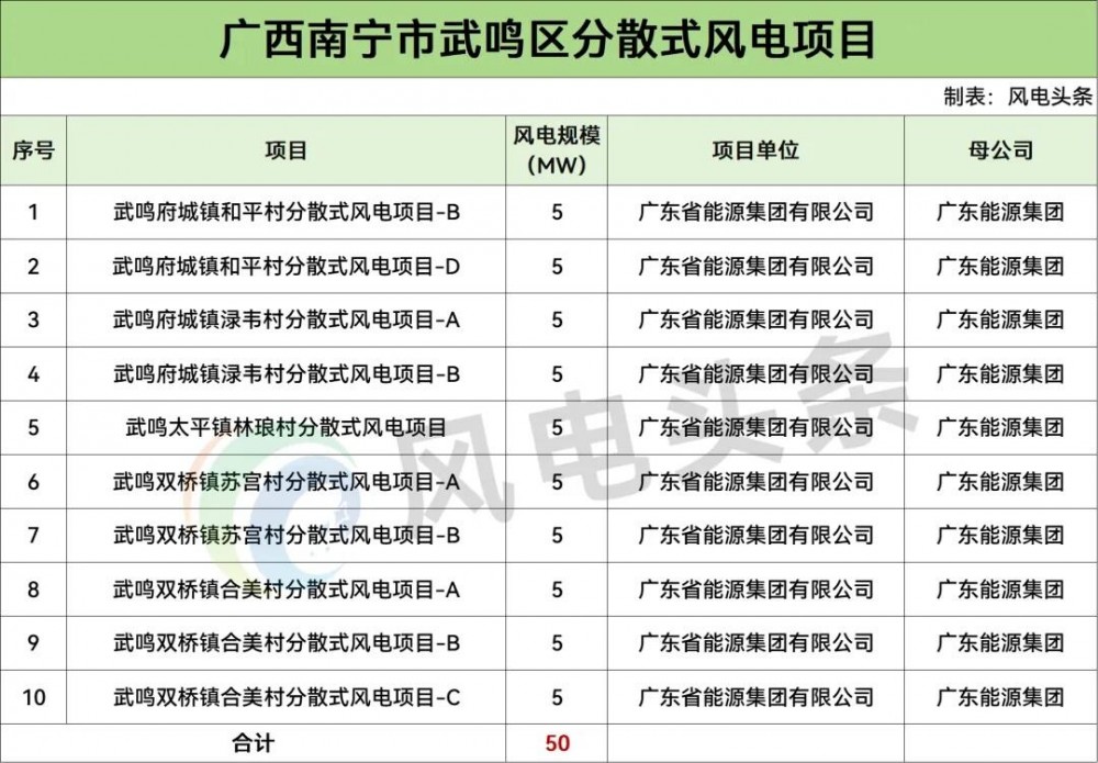 8 月 27 日,广西南宁市武鸣区 2025 年分散式风电建设项目公示,拟建设武鸣府城镇和平村分散式风电项目 - B 等 10 个项目,总容量 50MW,已纳入《南宁市分散式风电规划项目清单》。项目业主拟定为广东省能源集团有限公司。