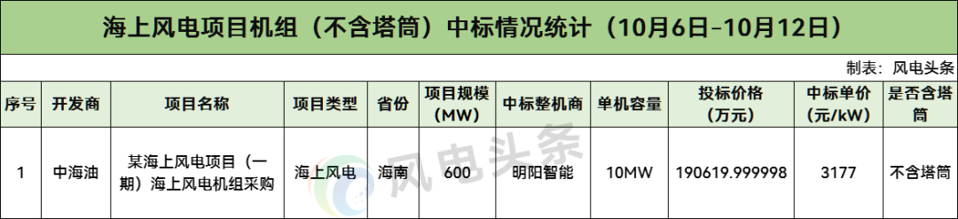 中海油开标600MW,由明阳智能中标。