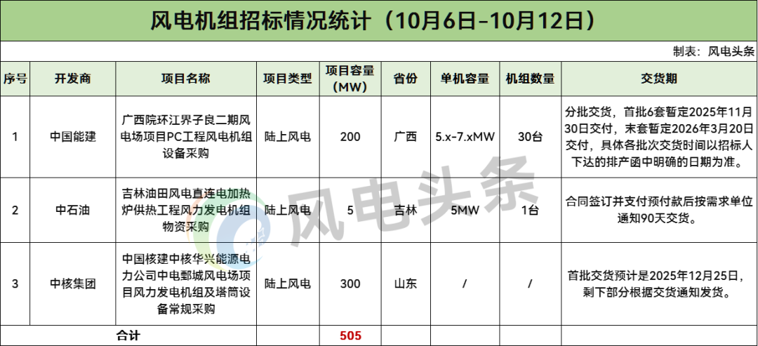 据新能源圈统计,10月6日-10月12日风电整机采购开标总计1242MW,风电机组招标总计505MW;风电塔筒开标总计1000MW。