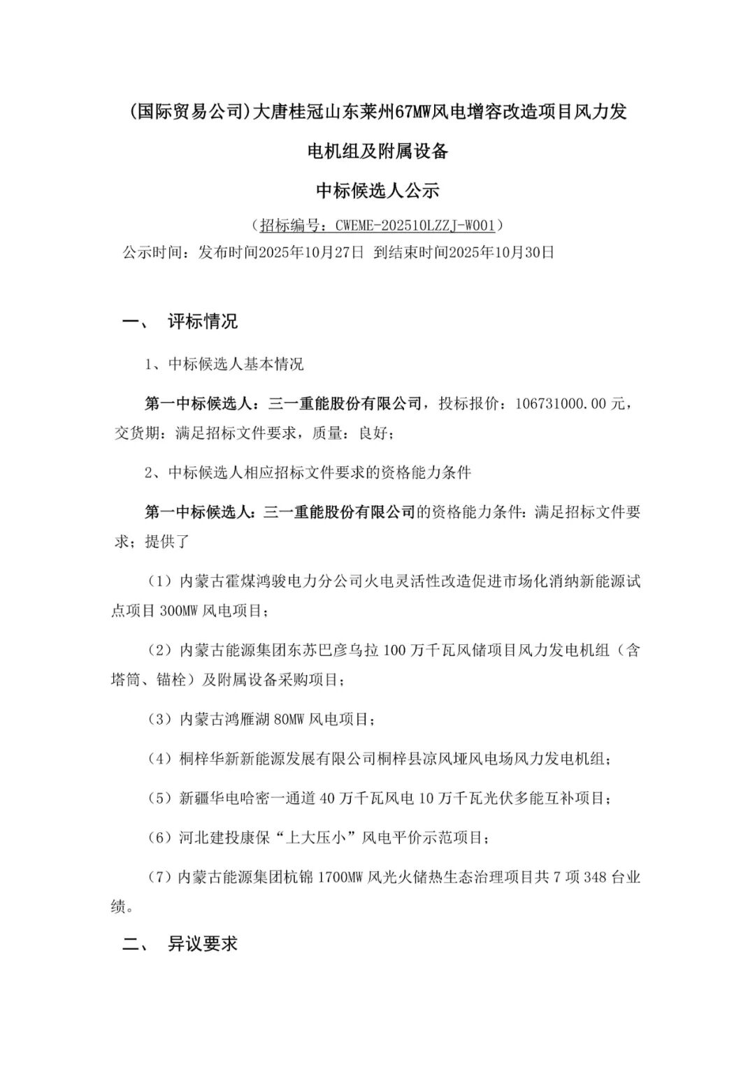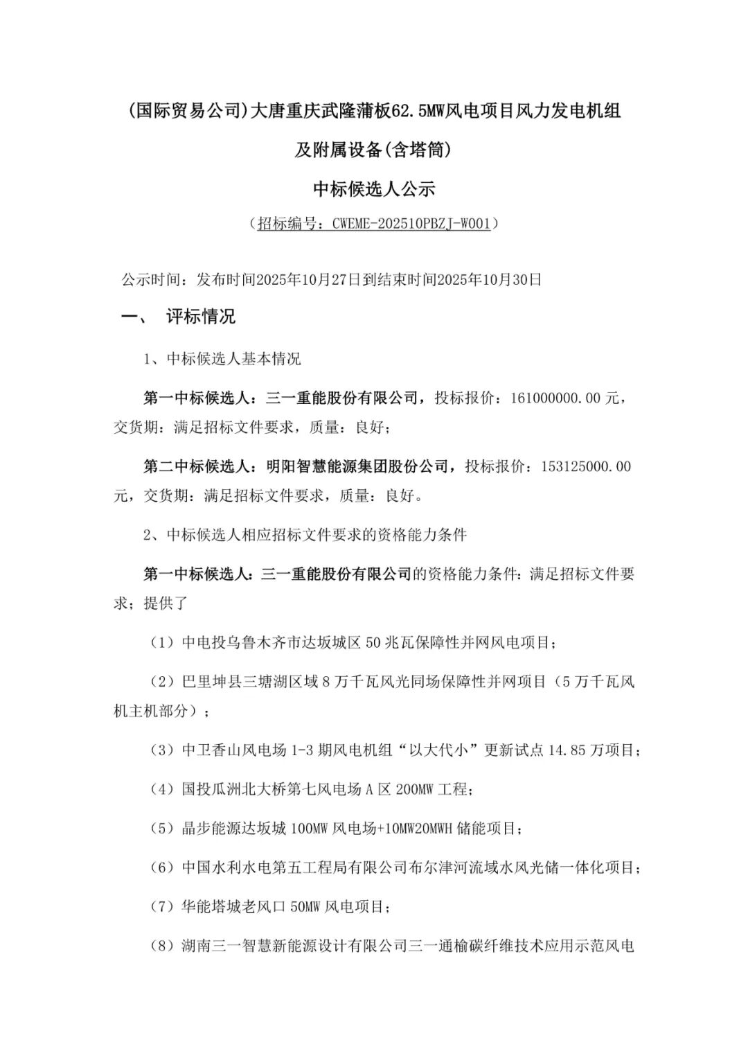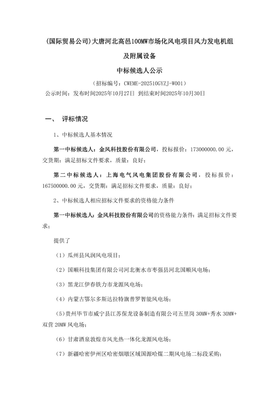 新能源圈获悉,10月27日,大唐河南灵宝青山二期50MW风电项目、大唐桂冠山东莱州67MW风电增容改造项目等4个风电项目风力发电机组及附属设备采购中标候选人公示,项目规模合计279.5MW。