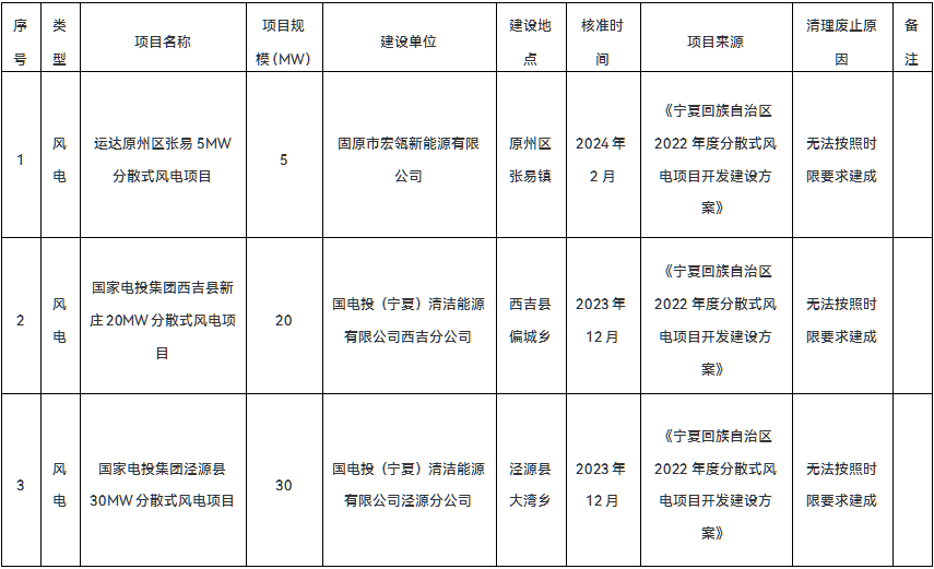 公告显示,经梳理,运达原州区张易5MW分散式风电项目(2022年度)、国家电投集团西吉县新庄20MW分散式风电项目(2022年度)、国家电投集团泾源县30MW分散式风电项目(2022年度)仍未实质性开工建设,无法按照时限要求建成,按要求进行废止。