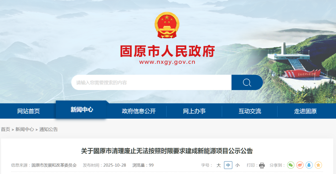 新能源圈获悉,10月28日,固原市发展和改革委员会发布关于固原市清理废止无法按照时限要求建成新能源项目公示公告。