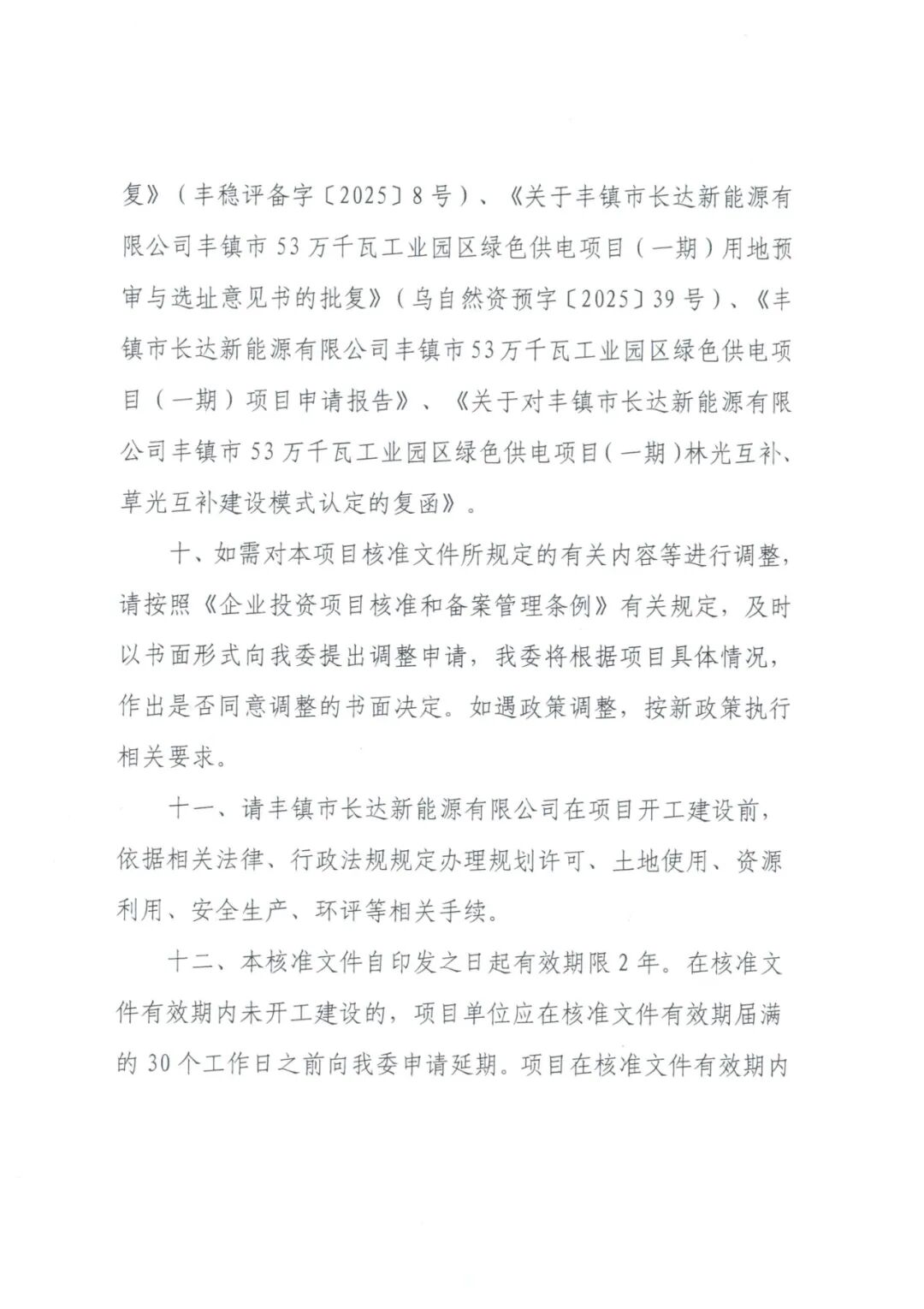 丰镇市长达新能源有限公司丰镇市53万千瓦工业园区绿色供电项目(一期)位于内蒙古自治区乌兰察布市丰镇市,项目单位为丰镇市长达新能源有限公司,项目装机规模26.45万千瓦,其中风电21.45万千瓦,光伏发电5万千瓦,配套建设3.9675万千瓦/4小时储能。项目总投资143498万元。