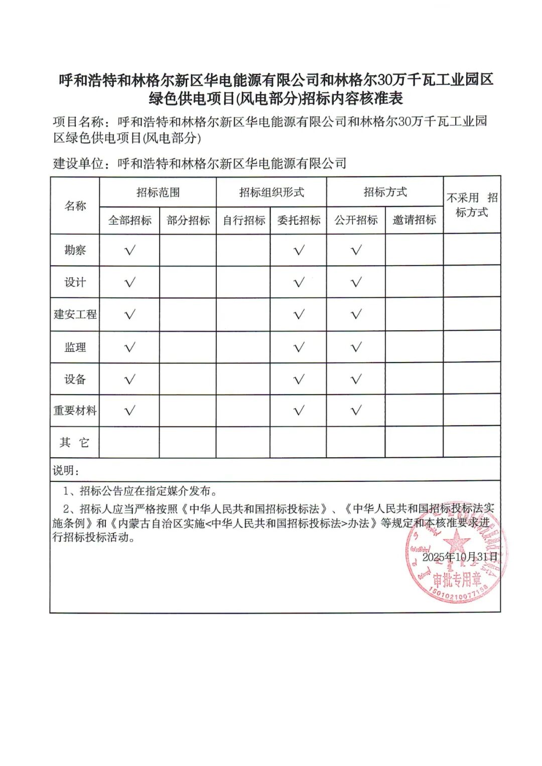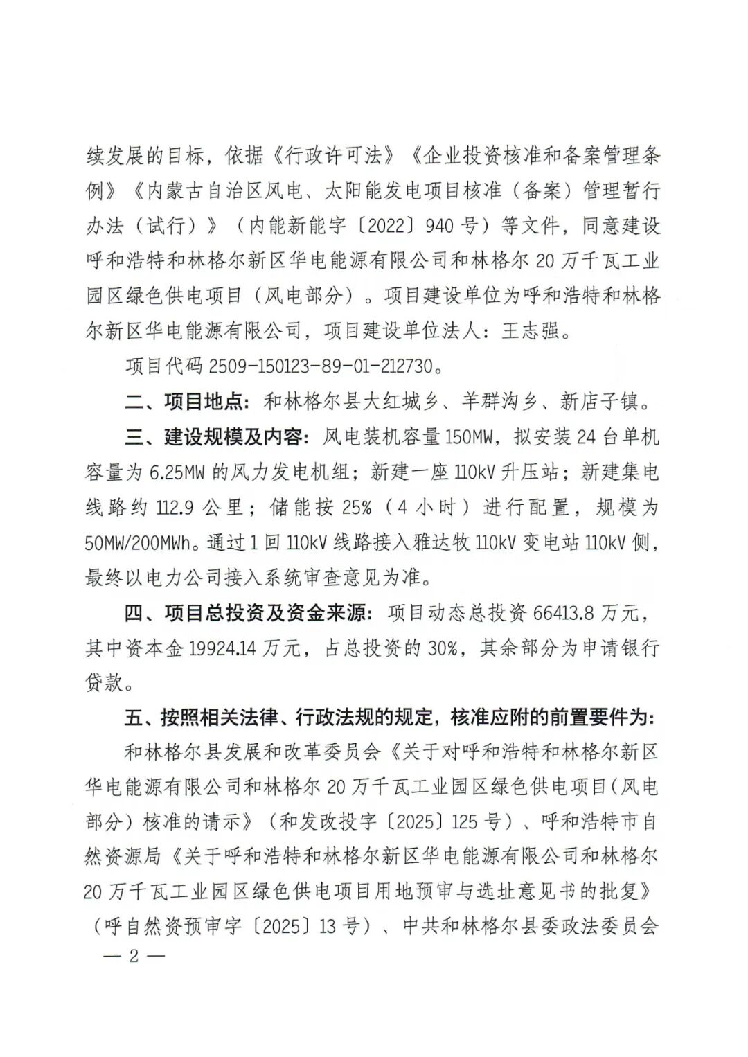 呼和浩特和林格尔新区华电能源有限公司和林格尔30万千瓦工业园区绿色供电项目(风电部分)位于和林格尔县大红城乡、城关镇,项目建设单位为呼和浩特和林格尔新区华电能源有限公司,风电装机容量260MW,拟安装42台单机容量为6.25MW的风力发电机组,储能按25%(4小时)进行配置,规模为75MW/300MWh。项目动态总投资115996.01万元。