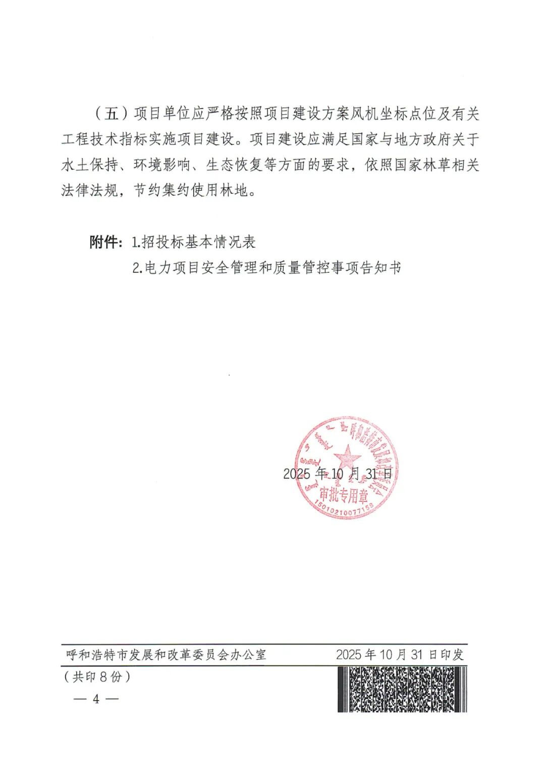 其中,呼和浩特和林格尔新区华电能源有限公司和林格尔20万千瓦工业园区绿色供电项目(风电部分)位于和林格尔县大红城乡、羊群沟乡、新店子镇,项目建设单位为呼和浩特和林格尔新区华电能源有限公司,风电装机容量150MW,拟安装24台单机容量为6.25MW的风力发电机组,储能按25%(4小时)进行配置,规模为50MW/200MWh。项目动态总投资66413.8万元。